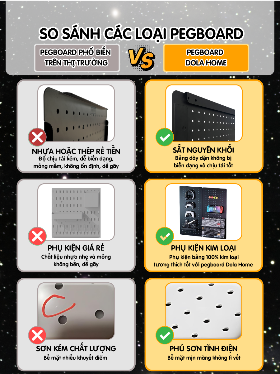 Bảng lỗ Pegboard Dola Home kim loại cao cấp treo tường. Phù hợp đặt ở góc làm việc, trang trí nhà cửa, trang trí bàn học Giải quyết ngăn nắp
