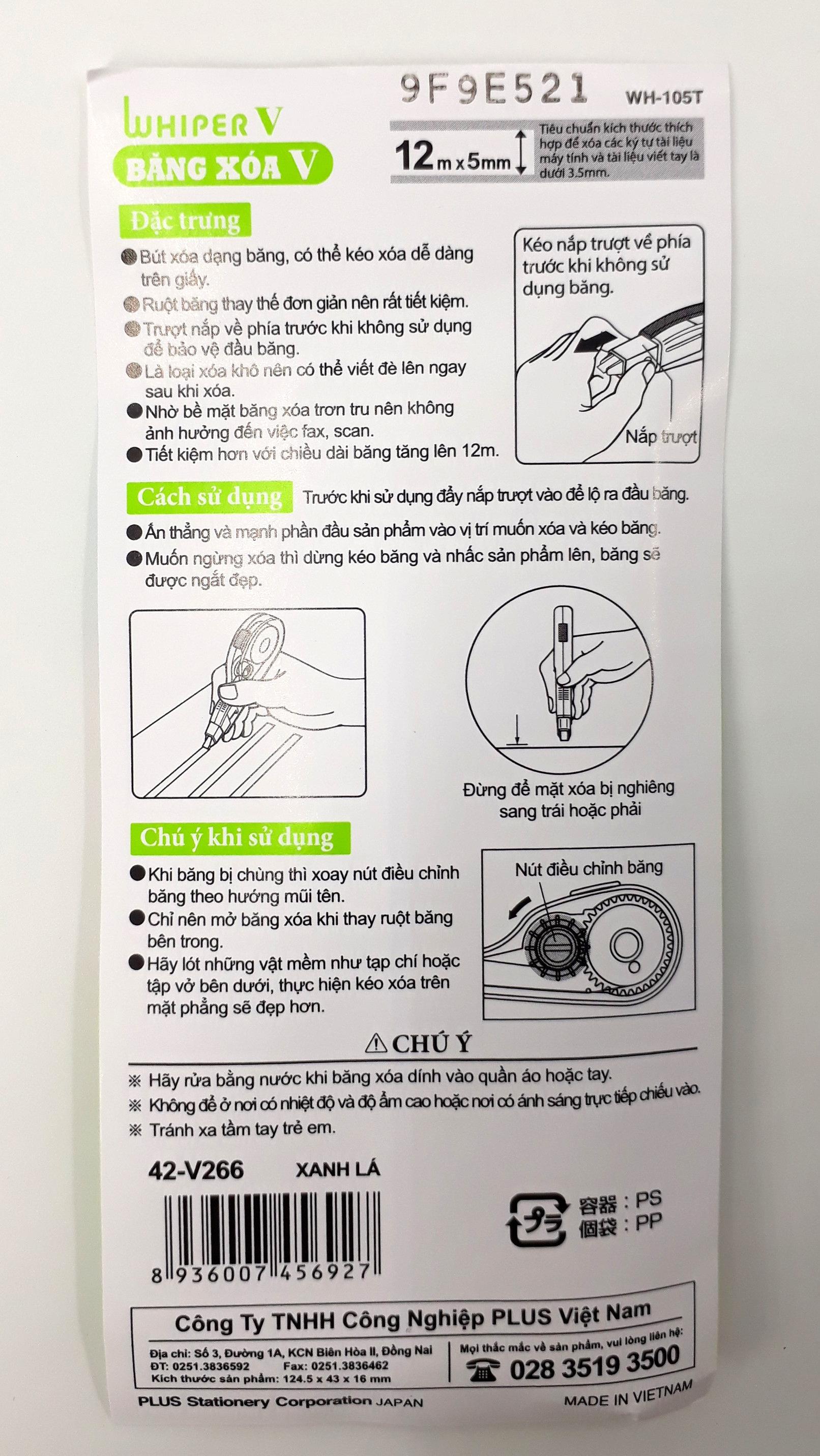 - Băng Xóa Plus V-42-V266 - Xanh Lá với thiết kế thông minh với đầu xóa nằm ngang giúp lực kéo êm, nhẹ nhàng, dễ dàng sử dụng. - Chiều dài băng xóa lớn và
