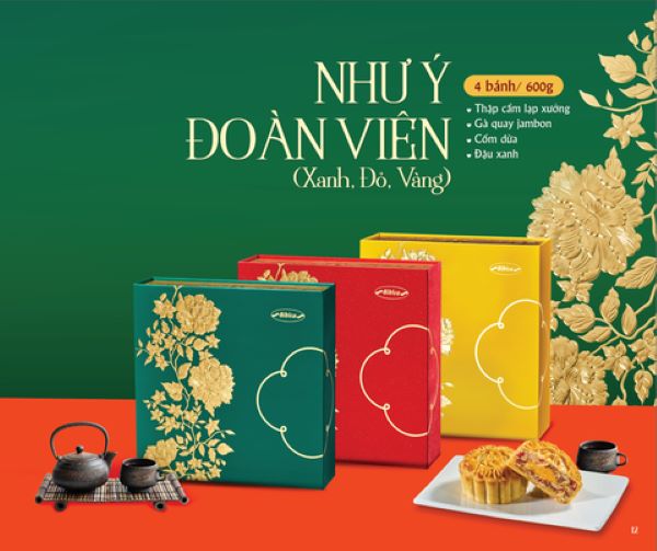 Hộp bánh Như Ý Đoàn Viên có 3 màu sắc lựa chọn: xanh, đỏ, vàng, tượng trưng cho sự may mắn, tài lộc và thịnh vượng. Thiết kế hộp sang trọng với họa tiết hoa văn tinh xảo, tạo nên vẻ đẹp đẳng cấp, là món quà ý nghĩa thể hiện tình cảm chân thành.