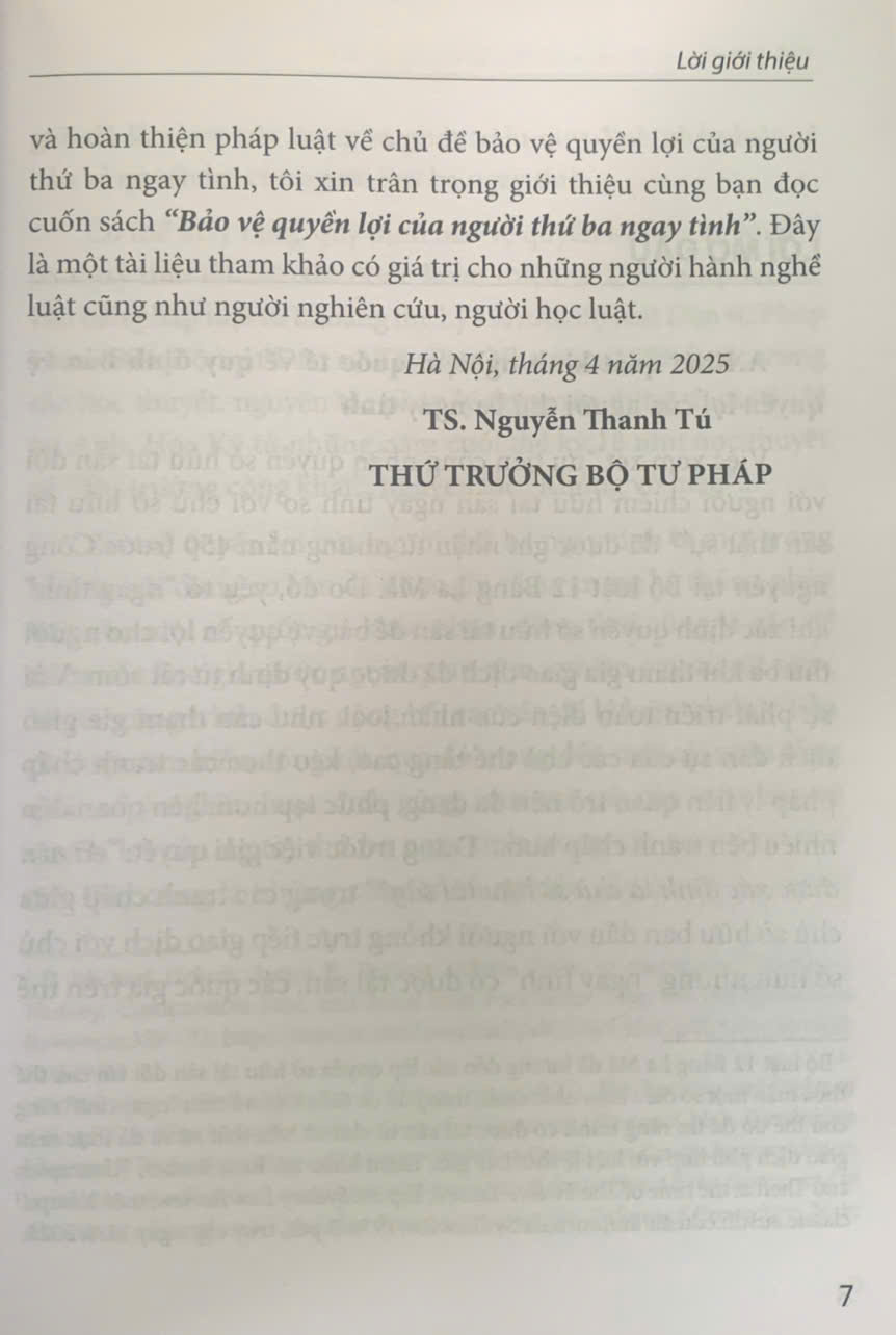 Bảo vệ quyền lợi của người thứ ba ngay tình (sách chuyên khảo) Tác giả: Ts. Đặng Thanh Hoa (chủ biên) Nhà xuất bản: Tư Pháp Công ty phát hành: NXB Tư Pháp Ngày xuất bản: 5. 2025 Khổ sách: 14,5*20,5cm Số trang: 348 Giá bìa: 200.000 đ Lời giới thiệu Việc xây dựng và hoàn thiện nhà nước pháp quyền xã hội chủ nghĩa, trong đó có hoàn thiện thể chế kinh tế thị trường định hướng xã hội chủ nghĩa, là một trong những nhiệm vụ trọng tâm, đột phá chiến lược, được xác định rõ trong Văn kiện Đại hội XIII của Đảng (năm 2021) và Nghị quyết số 27-NQ/TW ngày 09/11/2022 của Hội nghị lần thứ sáu Ban Chấp hành Trung ương Đảng khóa XIII. Trong bối cảnh đó, việc bảo vệ quyền lợi của người thứ ba ngay tình là hết sức quan trọng, góp phần bảo đảm tính ổn định, an toàn và giảm thiểu chi phí của các giao dịch dân sự, qua đó góp phần bảo đảm thượng tôn Hiến pháp, pháp luật và hoàn thiện nhà nước pháp quyền. Bảo vệ quyền lợi của người thứ ba ngay tình không phải là vấn đề mới, nhưng luôn mang tính thời sự, phụ thuộc vào thực tiễn sôi động của đời sống kinh tế, xã hội. Ở Việt Nam, chế định bảo vệ quyền lợi của người thứ ba ngay tình đã được hoàn thiện trong Bộ luật Dân sự năm 2015 nhưng việc áp dụng trong từng vụ việc cụ thể trong thực tiễn vẫn có thể còn gây nhiều tranh luận. Ví dụ, quan điểm và cách tiếp cận xử lý quan hệ dân sự trong các vụ án hình sự trong một số vụ việc, cụ thể là áp dụng Điều 133 Bộ luật Dân sự năm 2015 (về bảo vệ quyền lợi của người thứ ba ngay tình khi giao dịch dân sự vô hiệu) và Điều 47 Bộ luật Hình sự năm 2015, sửa đổi, bổ sung năm 2017 (về tịch thu vật, tiền trực tiếp liên quan đến tội phạm) trong Do đó, việc thể một số trường hợp còn chưa thống nhất. Do đó, việc tiếp tục nghiên cứu lý luận và thực tiễn của các khía cạnh pháp lý về bảo vệ quyền lợi của người thứ ba ngay tình là hết sức cần thiết, không chỉ cho người nghiên cứu, người học luật mà cả những người làm thực tiễn, như Thẩm phán, Luật sư, Công tố viên, Điều tra viên... và những người tham gia xây dựng chính sách, pháp luật. Cuốn sách chuyên khảo “Bảo vệ quyền lợi của người thứ ba ngay tình” do Tiến sĩ Đặng Thanh Hoa làm chủ biên là một đóng góp có giá trị ở cả phương diện lý luận và thực tiễn. Cuốn sách này đã phân tích các khía cạnh của việc bảo vệ quyền lợi của người thứ ba ngay tình một cách hợp lý, toàn diện; có so sánh với pháp luật của một số nước trên thế giới, xem xét thực tiễn áp dụng tại Việt Nam; từ đó đưa ra một số kiến nghị, đề xuất có giá trị từ nhiều góc độ. Một trong những thành công của Cuốn sách là đã trình bày và đánh giá, phân tích nhiều vụ việc cụ thể ở Việt Nam hết sức ngắn gọn, rõ ràng; từ đó giúp người đọc hiểu rõ hơn việc áp dụng pháp luật cũng như lý luận của vấn đề bảo vệ quyền lợi của người thứ ba ngay tình và rút ra kinh nghiệm cho bản thân. Với mong muốn tăng cường chất lượng, hiệu quả trong áp dụng, thi hành pháp luật; đẩy mạnh việc nghiên cứu, trao đổi và hoàn thiện pháp luật về chủ đề bảo vệ quyền lợi của người thứ ba ngay tình, tôi xin trân trọng giới thiệu cùng bạn đọc cuốn sách “Bảo vệ quyền lợi của người thứ ba ngay tình”. Đây là một tài liệu tham khảo có giá trị cho những người hành nghề luật cũng như người nghiên cứu, người học luật. Hà Nội, tháng 4 năm 2025a Nguyễn Thanh Tú –Thứ Trưởng Bộ Tư Pháp
