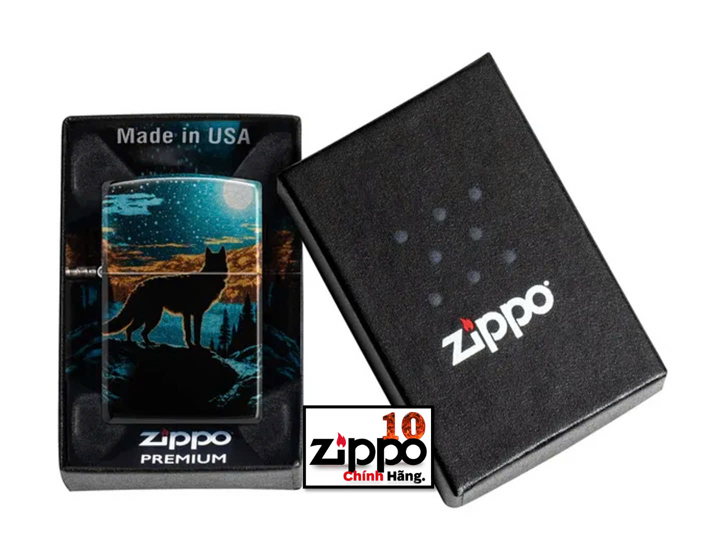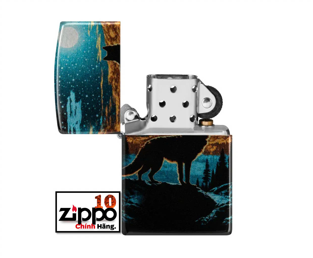 Một con sói đơn độc nhìn chằm chằm vào quang cảnh dưới ánh trăng trên chiếc bật lửa Tumbled Chrome cổ điển này với thiết kế 540 Fusion rực rỡ. Được đóng gói trong hộp quà tặng. Để có hiệu suất tối ưu, hãy đổ đầy nhiên liệu bật lửa Zippo.