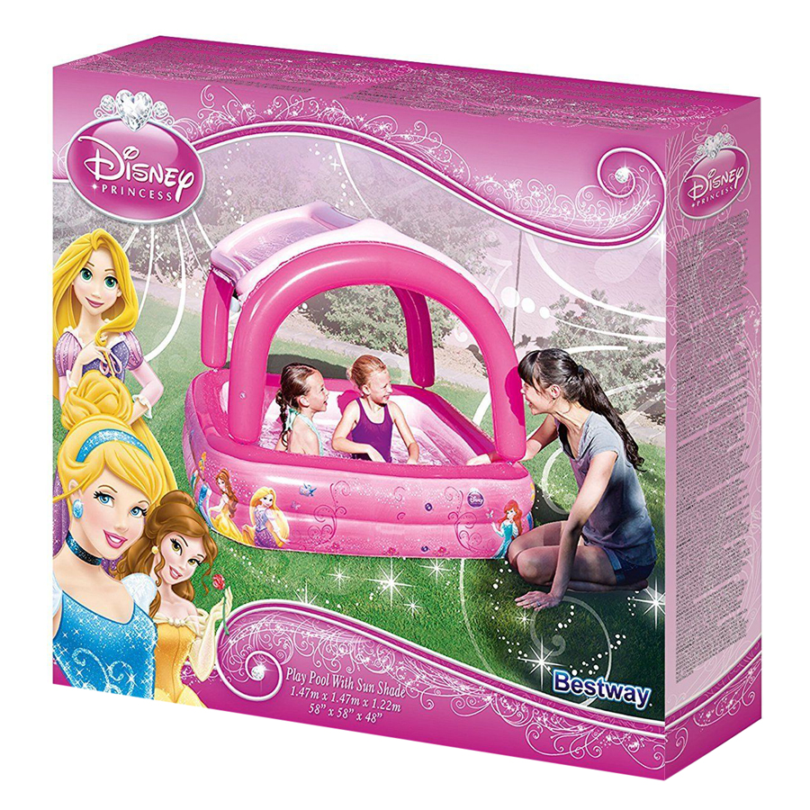 - Bể bơi phao có mái che chính hãng Bestway 91057 được thiết kế dành cho các thiên thần nhỏ bé với kiểu dáng rất ngộ nghĩnh, trên thành bể có in hình những cô công chúa điệu đà, kích thích trí tưởng tượng của trẻ nhỏ để bé hoàn thiện các kĩ năng xã hội đồng thời giúp bé không còn cảm giác sợ nước và tập bơi rất tốt.