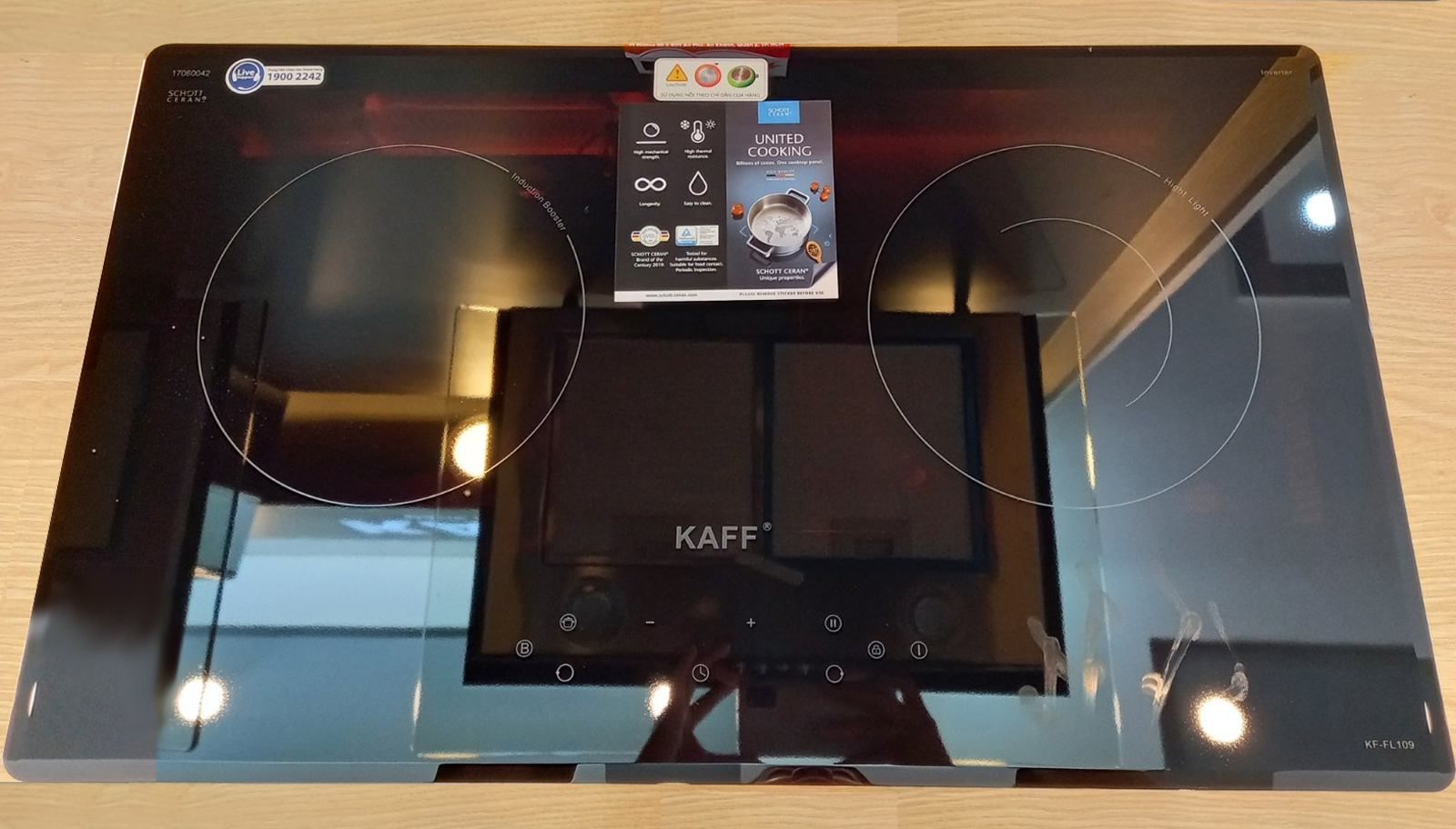 Bếp điện từ Kaff KF-FL109 gồm 2 vùng nấu với tổng công suất 4000W, vùng nấu từ trái có công suất 1800W khi kích hoạt tính năng nấu nhanh Booster công suất lên tới 3500W, vùng nấu hồng ngoại phải sử dụng mâm nhiệt E.G.O Hi-Light với 02 vòng nhiệt có công suất tối đa 2200W. Chỉ trong chốc lát sau khi kích hoạt tính năng này, nhiệt lượng trên vùng nấu từ tăng lên công suất tương đương với mức nhiệt lượng lớn nhất. Do đó, các món ăn được nấu chín nhanh hơn, tiết kiệm thời gian vào bếp cho chị em nội trợ. Chức năng Booster nấu siêu nhanh, tuy nhiên thời gian tối đa mặc định dùng chức năng này là 10 phút / lần tránh quá tải.Toàn cảnh - Bếp điện từ Kaff KF-FL109 - Nhập khẩu nguyên chiếc từ CHLB Đức