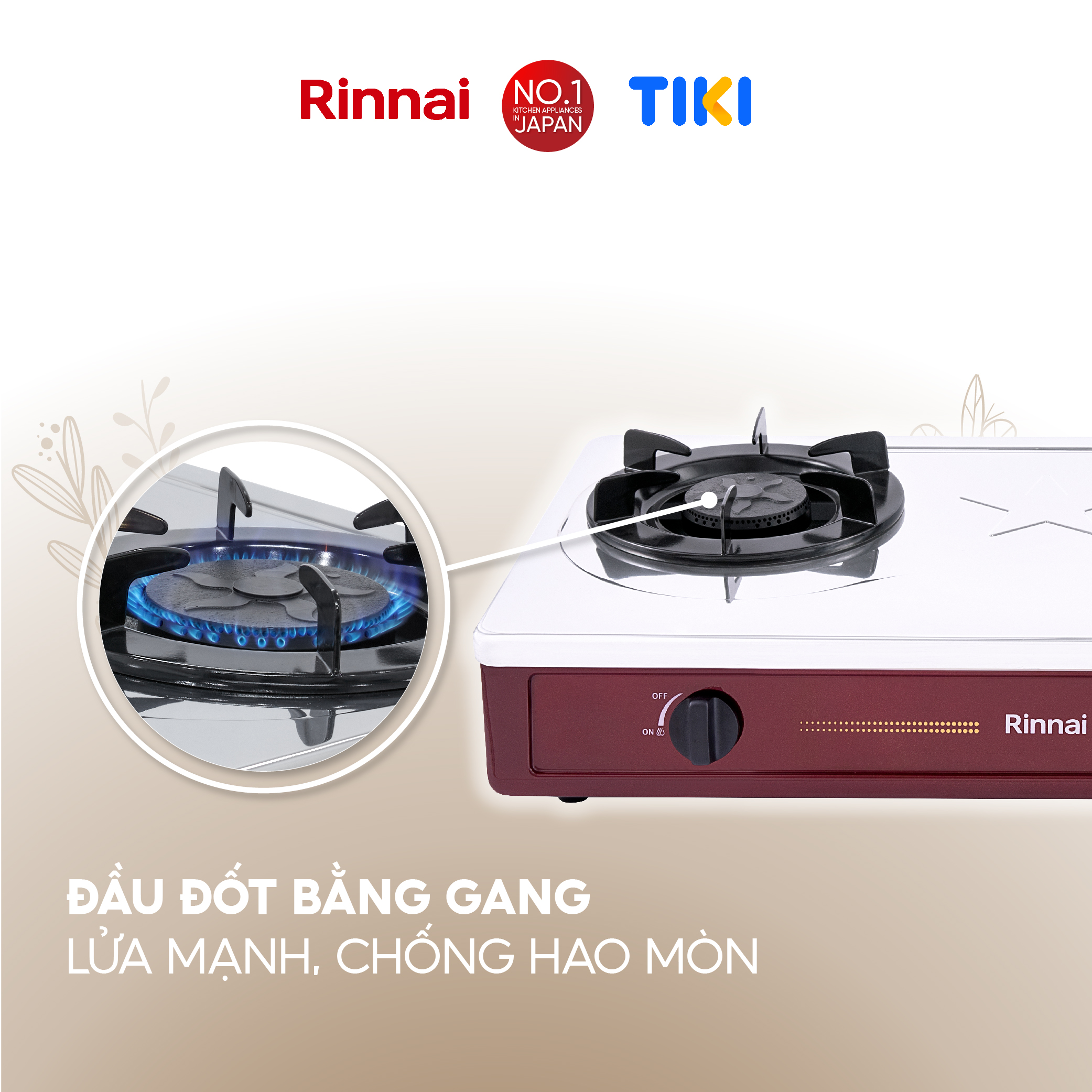 * Mặt kiếng cao cấp chịu lực, chịu nhiệt, thiết kế hoa văn sang trọng;  - Thân bếp làm bằng inox chống rỉ sét, cao 60mm;   - Núm vặn kiểu Rinnai;   - Kiềng thép sơn