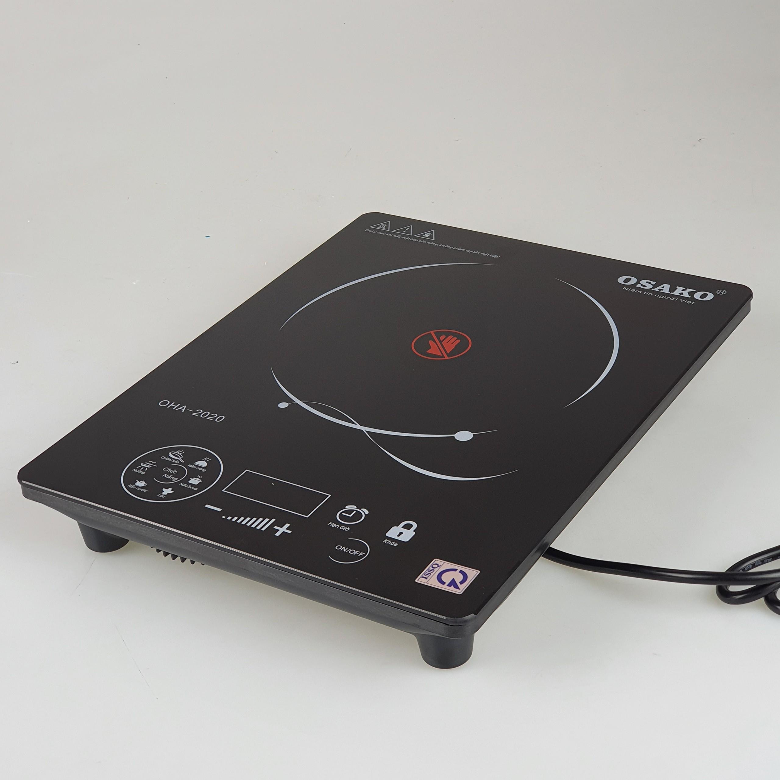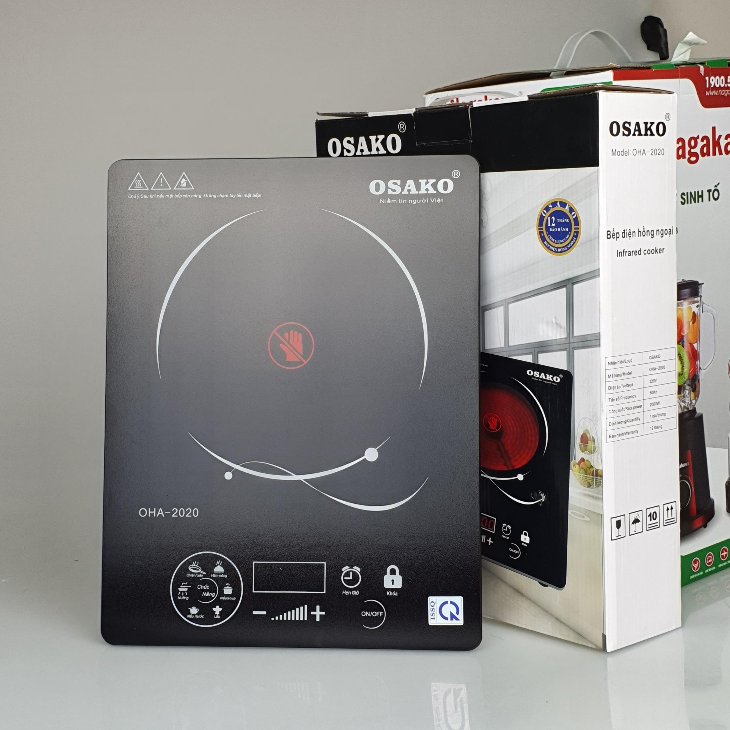 Bếp hồng ngoại không kén nồi, bếp điện hồng ngoại mặt kính ceramic, siêu bền Osako OHA-2020 ️ CÔNG SUẤT 2000W, ĐIỀU CHỈNH NHIỆT ĐỘ: Bếp sở hữu công suất lên đến 2000W, điều khiển nhiệt độ bằng cảm ứng. Nhiệt độ của bếp có thể điều chỉnh phù hợp nấu nhiều loại thức ăn như sữa, bột em bé, hâm thức ăn, cho đến các loại thức ăn cần nhiệt cao như chiên, nấu lẩu, ️ MẶT KÍNH CERAMIC SIÊU BỀN, CHỐNG TRẦY XƯỚC, DỄ DÀNG VỆ SINH: Kính Ceramic là loại vật liệu rất cứng, bền, chống trầy xước tốt, chịu được mức nhiệt rất cao và ít ảnh hưởng khi sốc nhiệt do đó được sử dụng làm mặt kính bếp điện như bếp từ, bếp hồng ngoại. Mặt kính Ceramic khó bị bám dính nên rất dễ dàng lau chùi khi bị thức ăn văng xuống. Bếp có thể chịu được trọng lượng lên đến 25Kg ️ CHỨC NĂNG HẸN GIỜ, CẢNH BÁO ÂM THANH, TẠM DỪNG NẤU: Bếp thiết kế các chức năng nhằm tạo thuận tiện cho người sử dụng như: chức năng hẹn giờ nấu giúp bạn có thể làm việc khác khi đang nấu, chức năng tạm dừng khiến bếp không cần thời gian khởi động giữa các lần nấu - không cần tắt bếp, cảnh báo âm thanh làm cho bạn có thể kiểm soát tốt hơn mà không cần nhìn ️ NHIỀU CHỨC NĂNG NẤU: Bếp thiết kế sẵn nhiều chức năng nấu với các mức nhiệt đã được thử nghiệm, tiện lợi hơn cho mọi người sử dụng. Chức năng: Nấu Soup, nấu nước, nấu lẩu, nướng, chiên/xào, hâm nó THÔNG SỐ KỸ THUẬT Tên sản phẩm: Bếp hồng ngoại Osako OHA-2020 Loại sản phẩm: Bếp đơn Điện áp: 220V - 240V Tần số: 50Hz - 60Hz Công suất: 2000W Chất liệu mặt bếp: Kính Ceramic cường lực Bảng điều khiển: Cảm ứng Hẹn giờ: Có Cảnh báo âm thanh: Có Xuất xứ: Chính hãng Osako Sản xuất: Trung Quốc Bảo hành: 12 tháng chính hãng trên toàn quốc.
