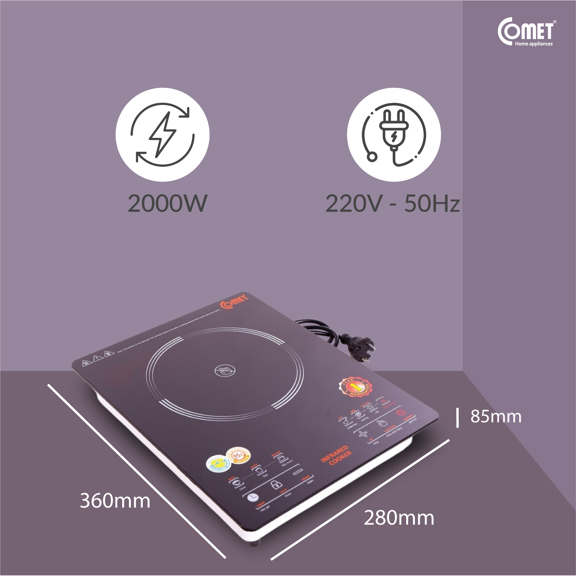 THÔNG TIN KỸ THUẬT: 1.Thương hiệu : COMET 2.Sản phẩm : Bếp hồng ngoại ( nút cảm ứng) 3.Mã sản phẩm : CM5536 4.Điện áp : 220V - 50Hz 5.Công suất: 2000W 6.Kích thước :