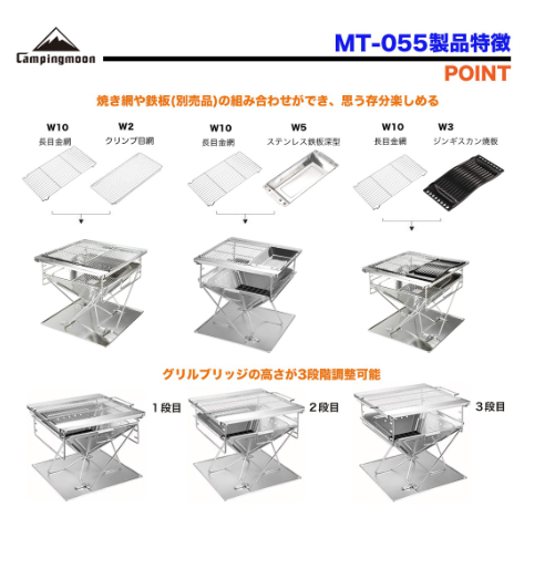 BẾP NƯỚNG THAN HOA GẤP GỌN 8-10 NGƯỜI CAMPINGMOON MT-055 * THÔNG TIN SẢN PHẦM: - Thương hiệu: Campingmoon - Mã sản phẩm: MT-055 - Chất liệu: Thép không gỉ, Gang, Inox - Kích thước lắp ráp (W x D x H): 51 x 47 x 43,5 cm - Kích thước túi đựng: 45 x 45 cm - Kích thước vỉ nướng: 32 x 44 cm. Ống thép đặc phi 8 mm - Tổng trọng lượng: Xấp xỉ 10,6 kg - Phụ kiện: Túi lưu vải Polyester - Xuất xứ Nhật Bản, lắp ráp tại Trung Quốc