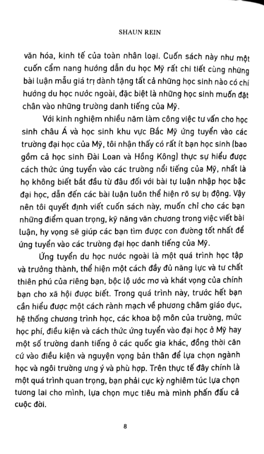 Với kinh nghiệm nhiều năm làm công việc tư vấn cho các học sinh châu Á và học sinh khu vực Bắc Mỹ ứng tuyển vào các trường đại học của Mỹ, Shaun Rein sẽ cũng cấp cho độc giả những chỉ dẫn thiết thực về chủ đề này: việc chọn trường, chuẩn bị hồ sơ, trình tự các bước và thời gian biểu trong thủ tục ứng tuyển, cùng với những phân tích và đánh giá thứ hạng 25 trường đại học hàng đầu nước Mỹ.