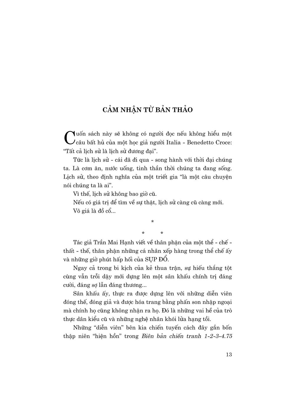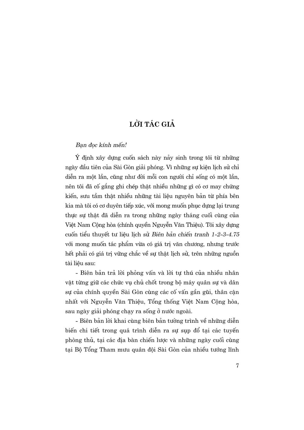 Nhằm đáp ứng yêu cầu của bạn đọc, nhân dịp kỷ niệm 50 năm Ngày giải phóng miền Nam, thống nhất đất nước (30/4/1975 - 30/4/2025), Nhà xuất bản Chính trị quốc gia Sự thật xuất bản lần thứ sáu cuốn tiểu thuyết tư liệu lịch sử Biên bản chiến tranh 1-2-3-4.75 của nhà báo, nhà văn Trần Mai Hạnh.