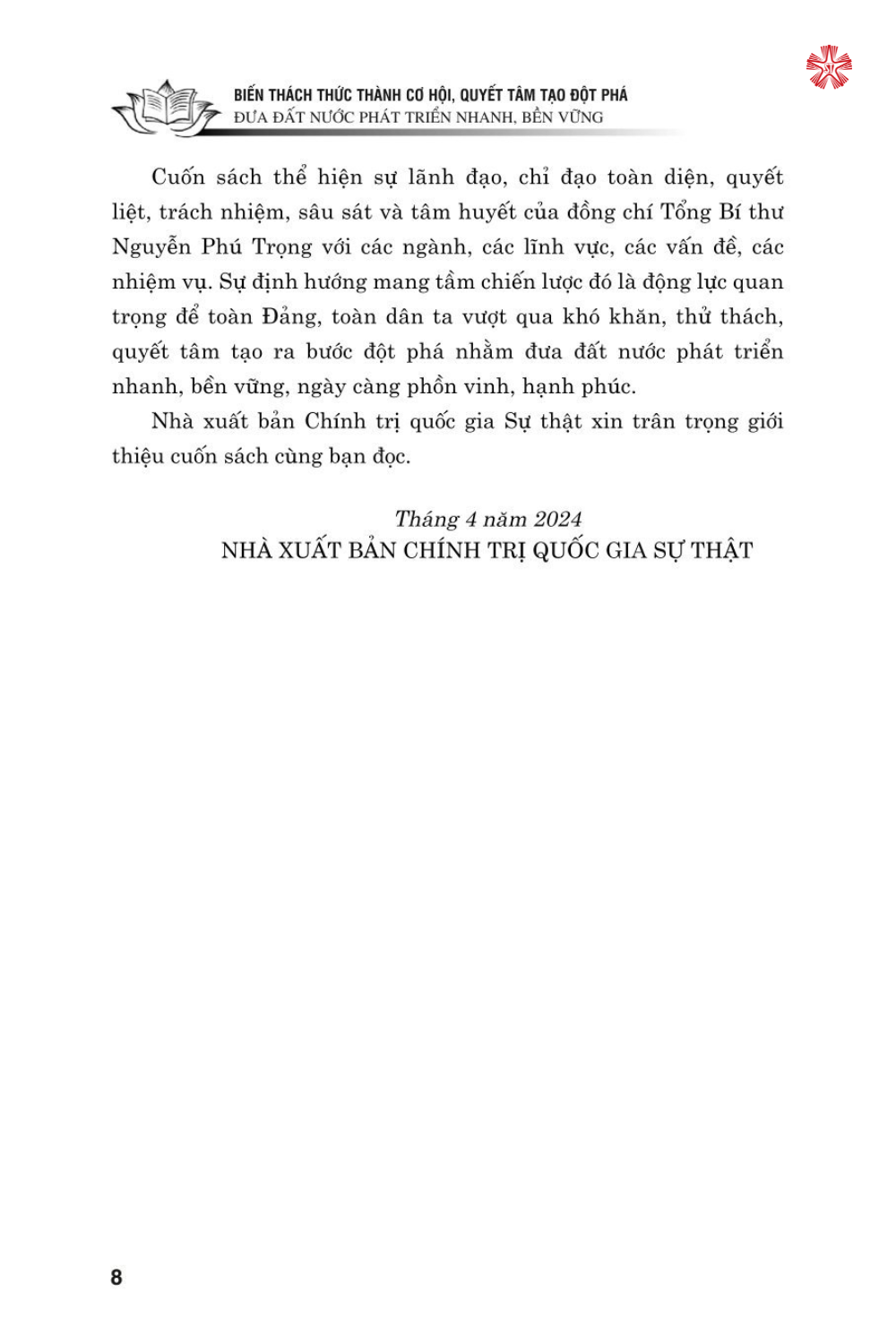 Cuốn sách “Biến thách thức thành cơ hội, quyết tâm tạo đột phá đưa đất nước phát triển nhanh, bền vững” tuyển chọn các bài phát biểu, bài viết, bài trả lời phỏng vấn, thư,