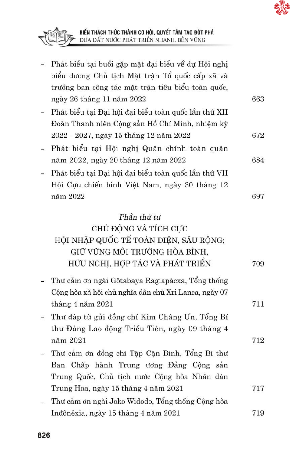 Cuốn sách “Biến thách thức thành cơ hội, quyết tâm tạo đột phá đưa đất nước phát triển nhanh, bền vững” tuyển chọn các bài phát biểu, bài viết, bài trả lời phỏng vấn, thư, điệ của đồng chí Tổng Bí thư Nguyễn Phú Trọng từ tháng 4/2021 đến tháng 12/2022.