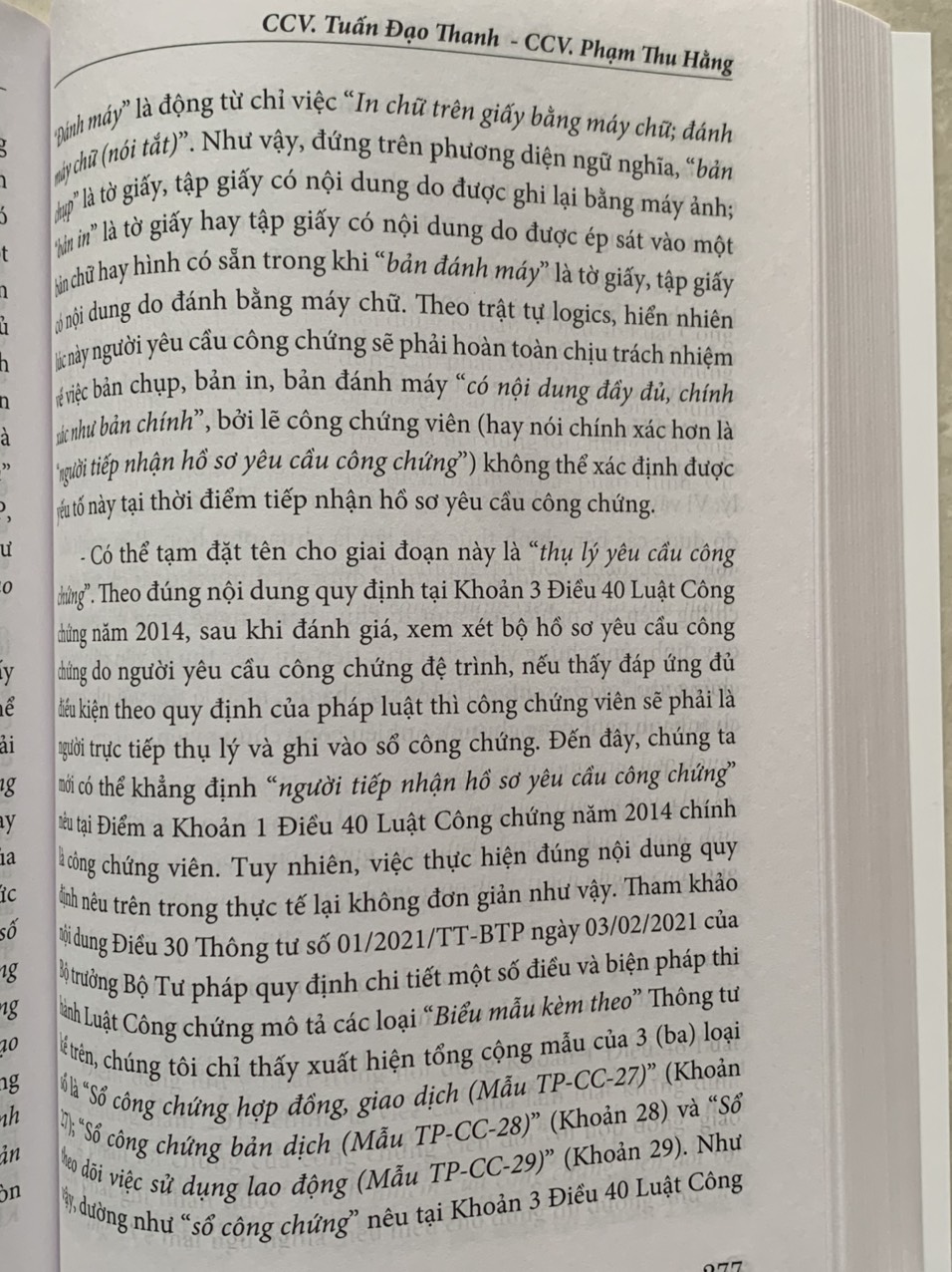 Trong mỗi chương các tác giả đều trình bày nhận xét tổng quan, tiếp đó phân tích, bình luận từng điều luật dựa trên kinh nghiệm hành nghề thực tế của bản thân xuất phát từ yêu cầu, đòi hỏi khách quan của cuộc sống và được so sánh với nội dung những văn bản quy phạm pháp luật điều chỉnh một số lĩnh vực có liên quan mật thiết đến hoạt động công chứng, đồng thời đề cập một số quan điểm còn có thể có ý kiến đa chiều để bạn đọc tiếp cận. Dù các tác giả đã dành sự tâm huyết và cố gắng trong quá trình biên soạn nhưng cuốn sách khó tránh khỏi những hạn chế, thiếu sót nhất định. Các tác giả và Nhà xuất bản rất mong nhận được ý kiến đóng góp của bạn đọc.