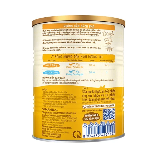 - Sản phẩm này là thức ăn bổ sung và được ăn thêm cùng với sữa mẹ dùng cho trẻ trên 06 tháng tuổi Bột ăn dặm RiDielac Gold dễ tiêu hóa được nghiên cứu bởi các chuyên gia từ Trung tâm nghiên cứu dinh dưỡng và phát triển sản phẩm VINAMILK, đáp ứng nhu cầu dinh dưỡng cho trẻ từ 6 đến 24 tháng tuổi, giúp bổ sung các dưỡng chất, hỗ trợ bé phát triển thể chất trong thời gian ăn dặm. HỖ TRỢ SỨC KHỎE HỆ TIÊU HÓA Bổ sung lợi khuẩn Bifidobacterium, BB-12TM cùng chất xơ hòa tan inulin giúp tăng vi khuẩn có lợi, ức chế vi khuẩn có hại, hỗ trợ tốt sức khỏe hệ tiêu hóa, giúp bé hấp thu nguồn dưỡng chất dồi dào, cho bé phát triển thể chất khỏe mạnh. BB-12 là thương hiệu của Chr. Hansen A/S. HỖ TRỢ DƯỠNG CHẤT CHO BÉ ĂN NGON VÀ KHỎE MẠNH Lysin, vitamin nhóm B và Kẽm giúp bé ăn ngon miệng. Ngoài ra, sản phẩm có chứa 21 vitamin và khoáng chất bao gồm Sắt, Canxi, vitamin D3, C, A, E, giúp bé phát triển cứng cáp hơn. HỖ TRỢ PHÁT TRIỂN NÃO BỘ Axít folic, I ốt, Sắt, Taurin, Axít linoleic, đặc biệt DHA kết hợp với Lutein tạo thành hệ dưỡng chất thiết yếu cho sự phát triển của não bộ, võng mạc mắt, tăng khả năng nhận thức, ghi nhớ và học hỏi của bé. Dành cho trẻ từ 7-24 tháng tuổi. THÔNG SỐ SẢN PHẨM Thành phần trung bình (100g bột) Đơn vị 100g Bột Năng lượng/ Energy Kcal 425.0 Chất đạm/ Protein g 16.0 Chất béo/ Fat g 10.8 Acid linoleic mg 4,200.0 DHA (Docosahexaenoic acid) mg 20.0 Hydrat Cacbon/ Carbohydrate g 65.2 Chất xơ hòa tan/ Soluble fiber g 2.0 Lysin/ Lysine mg 1,000.0 Taurin/ Taurine mg 40.0 Lutein mcg 70.0 Độ ẩm/ Moisture g 2.5 Khoáng chất/ Minerals Natri/ Sodium mg 300.0 Kali/ Potassium mg 550.0 Calci/ Calcium mg 430.0 Phospho/ Phosphorus mg 260.0 Magnesi/ Magnesium mg 33.0 Sắt/ Iron mg 8.0 Iod/ Iodine mcg 80.0 Kẽm/ Zinc mg 3.5 Vitamin/ Vitamins Vitamin A IU 1,600.0 Vitamin D3 IU 260.0 Vitamin E mg 5.0 Vitamin K1 mcg 20.0 Vitamin C mg 52.0 Vitamin B1 mcg 820.0 Vitamin B2 mcg 650.0 Vitamin PP mg 6.7 Vitamin B6 mcg 810.0 Acid folic mcg 82.0 Acid Pantothenic mg 2.5 Vitamin B12 mcg 1.2 Biotin mcg 21.0 MẪU BAO BÌ THAY ĐỔI THEO TỪNG ĐỢT NHẬP HÀNG.