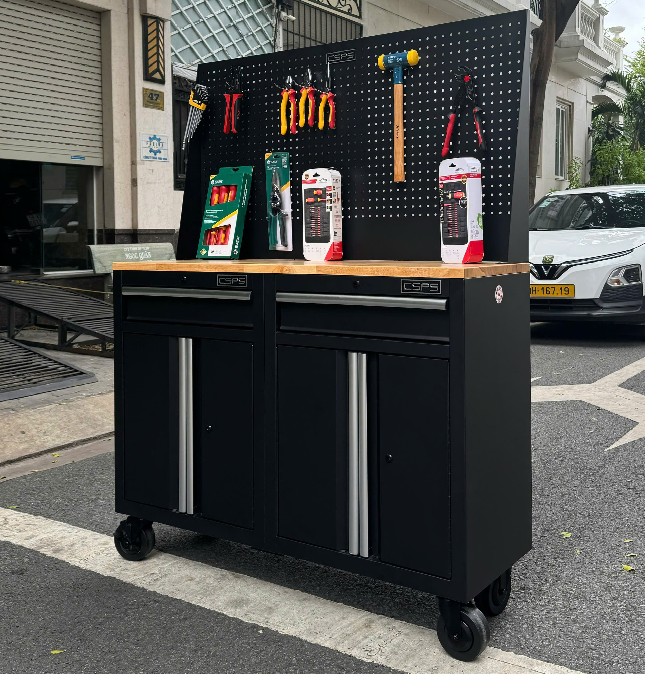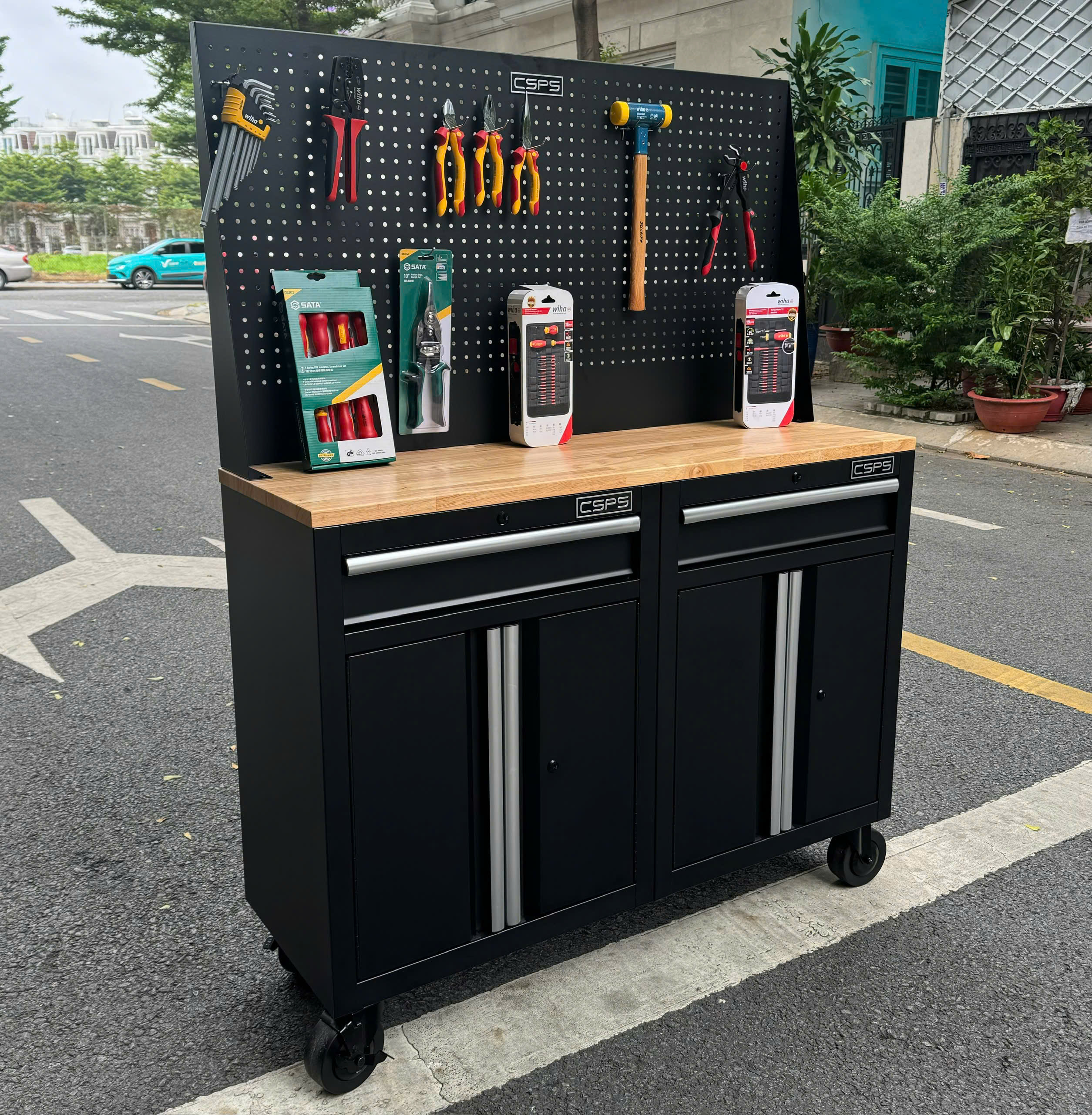 ✨Bộ 2 Tủ dụng cụ CSPS 122cm màu đen mặt ván gỗ kèm vách lưới - 02 hộc kéo (tay cầm trắng)