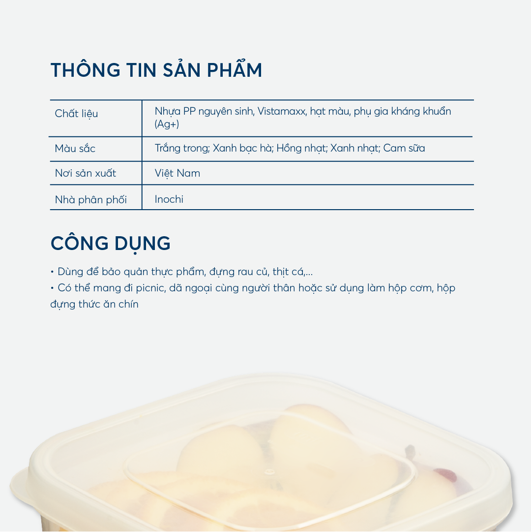 Kích thước: 162 x 162 x 105 mm Khối lượng: 374 g Chất liệu: Nhựa PP (Polypropylen) nguyên sinh, Vistamaxx, hạt màu, phụ gia kháng khuẩn (Ag+) Màu sắc: Trắng trong; Xanh bạc hà; Hồng
