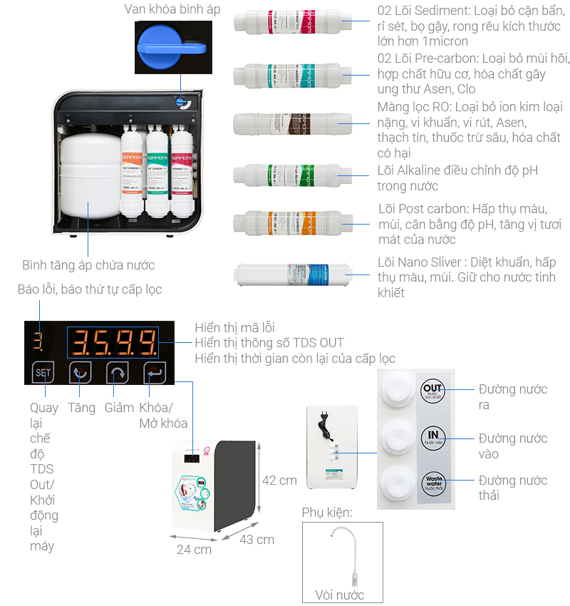- Lõi Nano Silver: Diệt khuẩn, khủ mùi, tạo vị ngọt tự nhiên cho nước. Hoàn toàn đảm bảo cho việc sử dụng trực tiếp. Thời gian thay thế lõi lọc nhanh hay chậm phụ thuộc vào nguồn nước nơi bạn đang sử dụng Chuẩn thời gian bên dưới được đo với nguồn nước máy - thuỷ cục