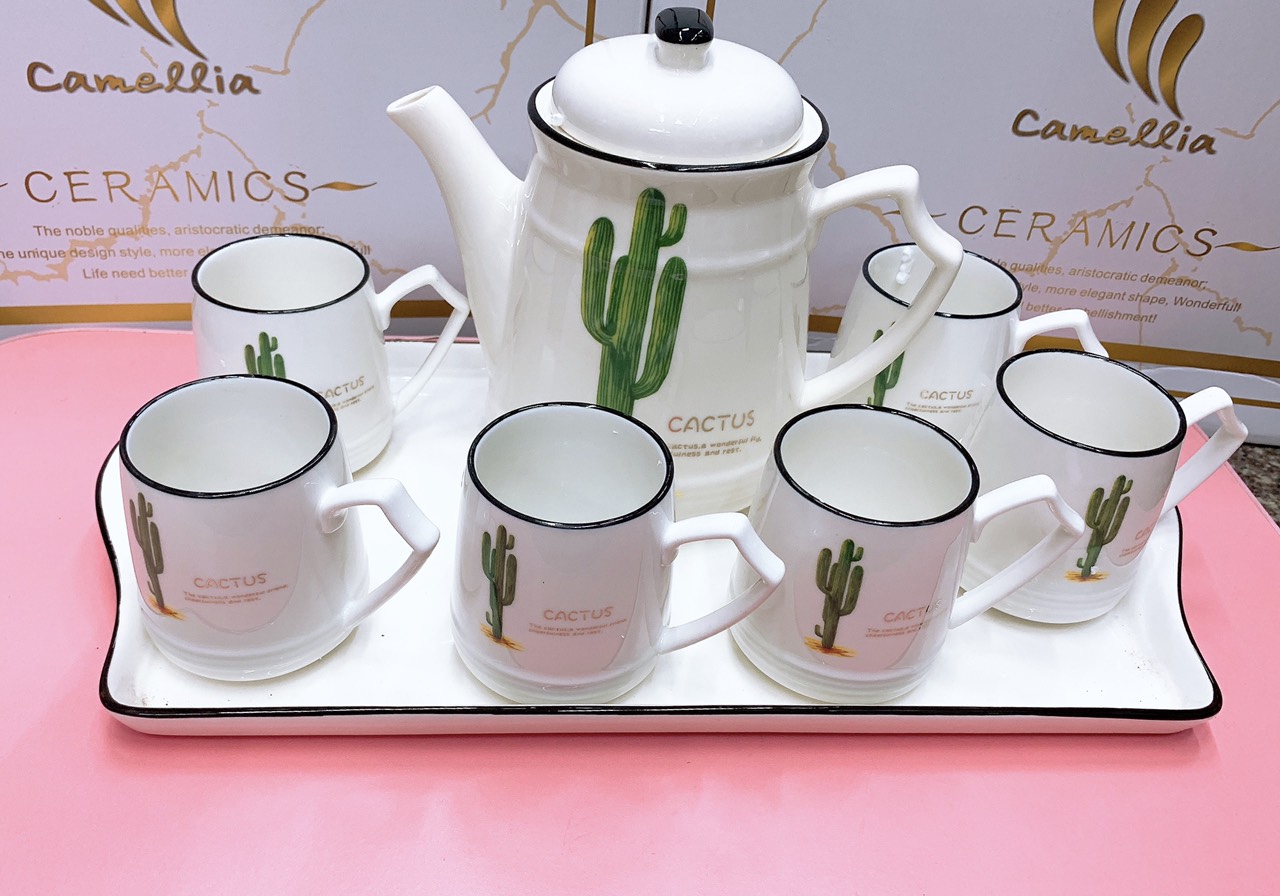✨Bộ ấm chén pha trà kèm khay sứ trắng họa tiết xương rồng cao - ANTH155