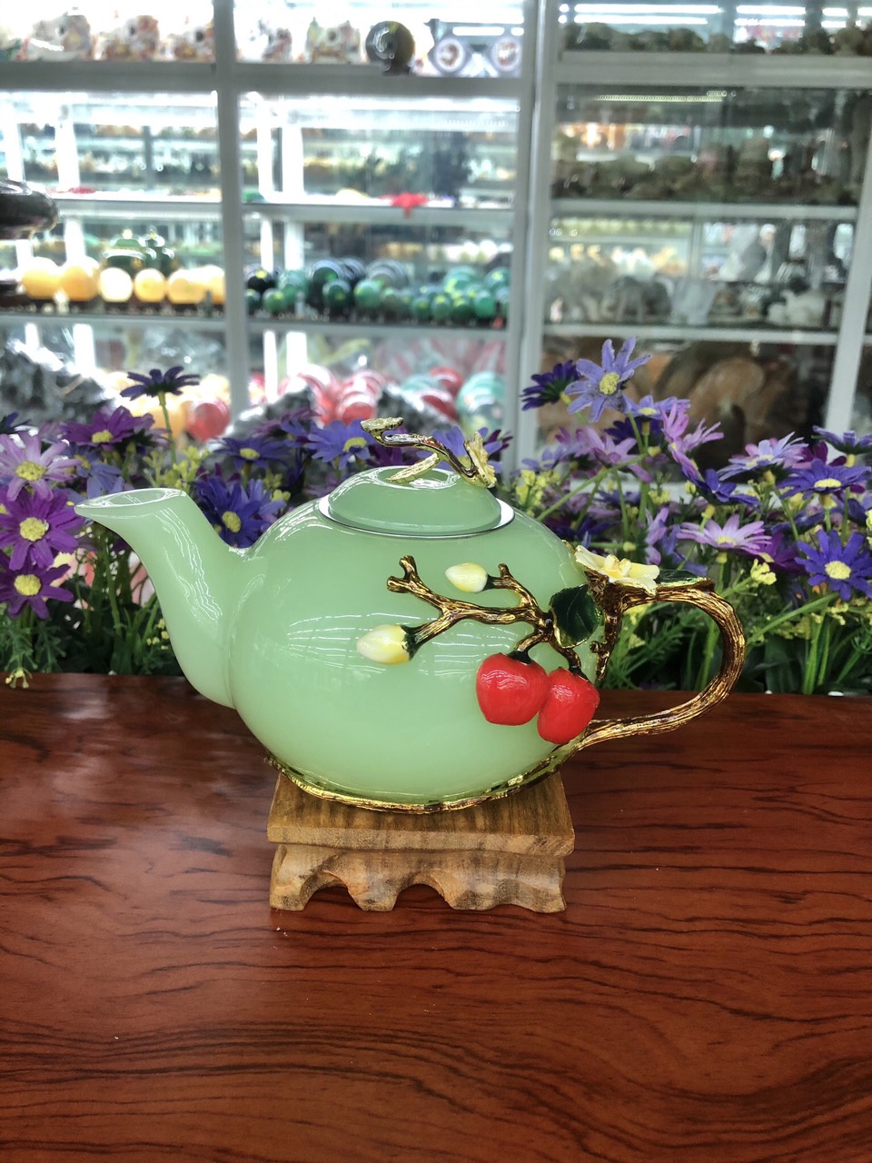 ✨Bộ ấm trà chạm cây táo với ly chạm chữ đá ngọc cẩm thạch xanh