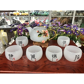 ✨Bộ ấm trà chạm hoa hồng với ly chạm chữ đá bạch ngọc