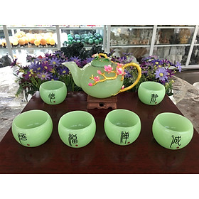 ✨Bộ ấm trà chạm hoa mai đá ngọc cẩm thạch xanh