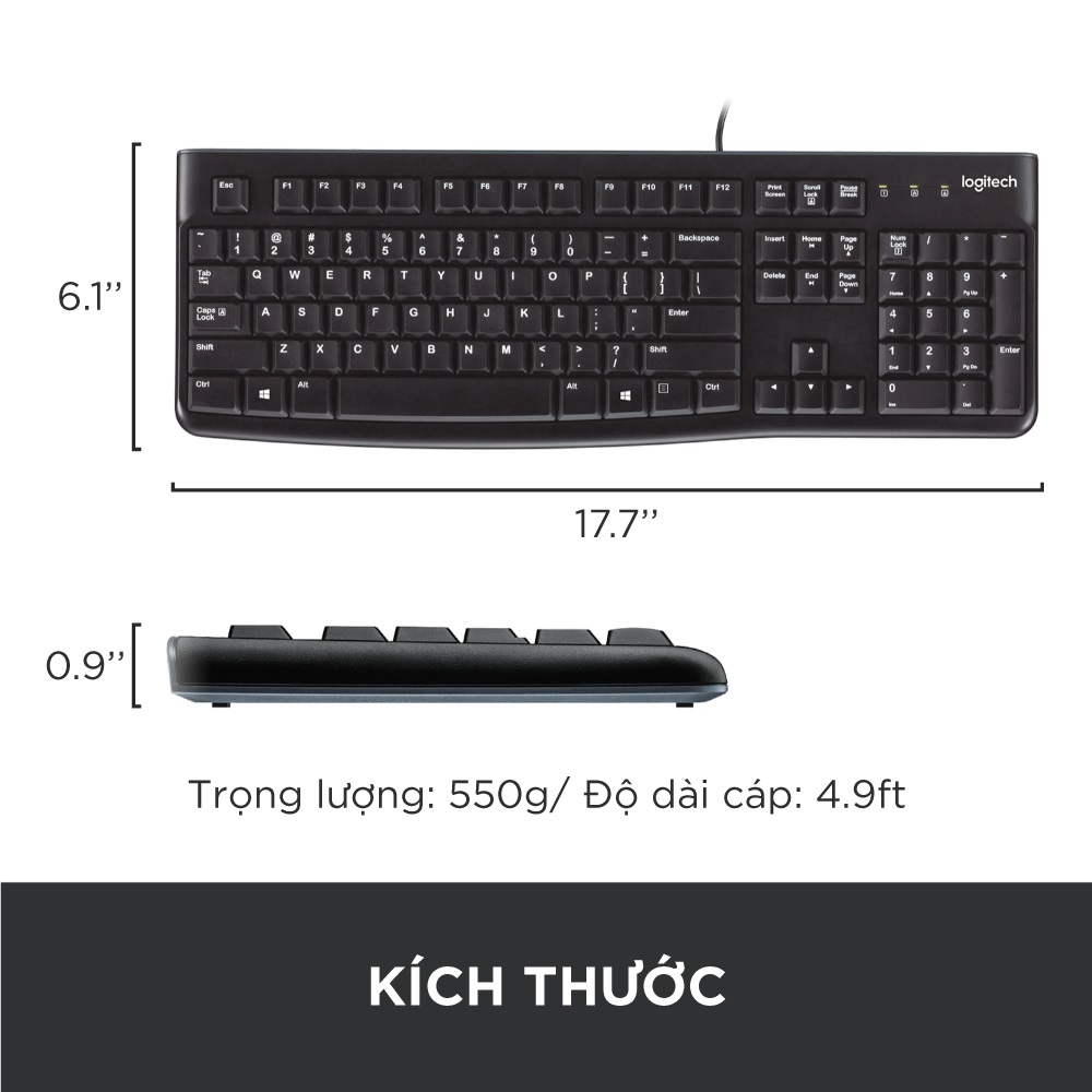 BỘ ĐÔI CHUỘT VÀ BÀN PHÍM MÁY TÍNH CÓ DÂY MK120(Chuột Logitech B100 và phím logitech K120) THÔNG SỐ KỸ THUẬT BÀN PHÍM K120 Logitech Thiết kế chống nước đổ tràn 4Được kiểm nghiệm trong