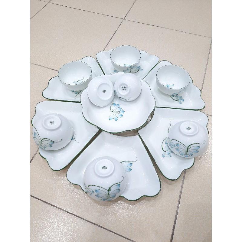Trọn bộ bát đĩa hoa mặt trời men kem hoa sen xanh gốm sứ Bát Tràng có gì?