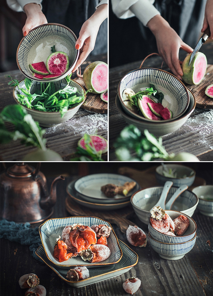 Bộ Bát Đĩa Gốm Sứ Hoa Văn Lá Dọc Phong Cách Nhật Bản Họa Tiết Thổ Cẩm, Thiết Kế Sang Trọng