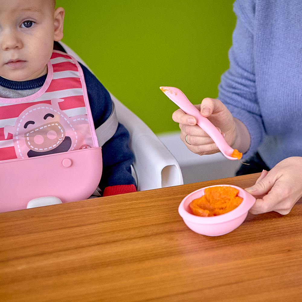 Bộ bát và thìa nghiền thức ăn cho bé là bộ đồ dùng ăn dặm bao gồm một thìa nghiền thức ăn 2 in 1 và một bát silicon. Bộ đồ dùng giúp việc cho bé từ 6 – 12 tháng ăn thức ăn đặc trở nên tiện lợi. Nghiền hoa quả và rau nhanh gọn với đầu dẹt của thìa, đổi đầu thìa và bắt đầu cho bé ăn! Đáy bát có các đường gờ để dễ nghiền thức ăn. Đầu thìa làm bằng silicon mềm và êm ái với nướu nhạy cảm của bé. Thìa cũng có giá đỡ để tránh tiếp xúc với mặt bàn gây mất vệ sinh. Bộ sản phẩm bát và thìa nghiền thức ăn được làm từ silicon cao cấp, không chứa BPA và Phthalate, dùng được với lò vi sóng và tủ đông. Có hai màu để bạn lựa chọn Hồng và Xanh.