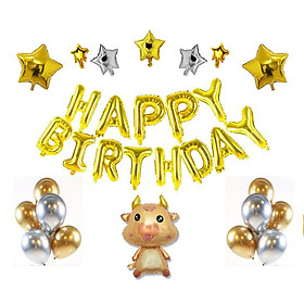 Gồm: - 1 bộ bong bóng chữ happy birthday - 1 bong bóng hình trâu vàng size lớn - 10 bong bóng siêu nhũ - 2 bong bóng hình ngôi sao 45cm - 3 bong