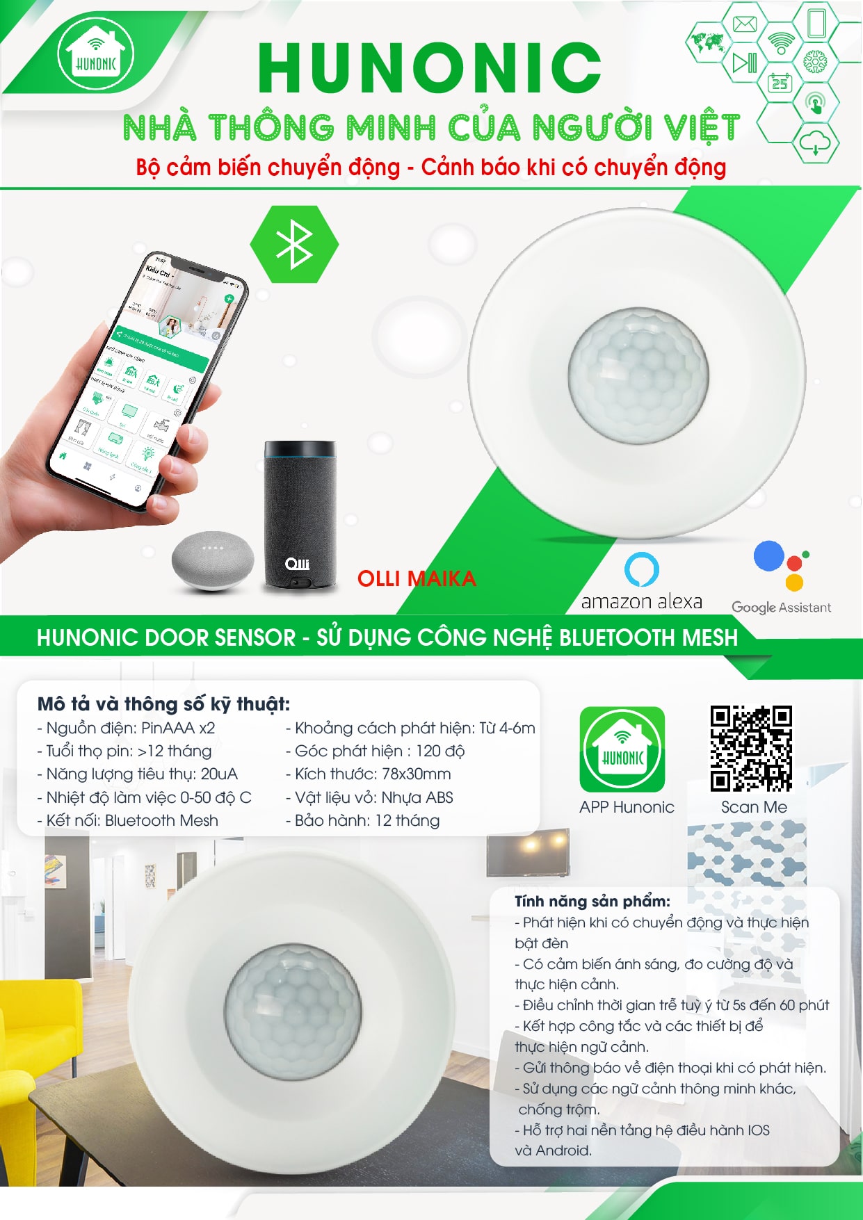 - Cảm biến chuyển động Hunonic Pir Sensor là một sản phẩm sử dụng công nghệ Bluetoot Mesh hoàn thiện đầu tiên tại Việt Nam. Thân và vỏ được làm từ nhựa ABS nguyên sinh