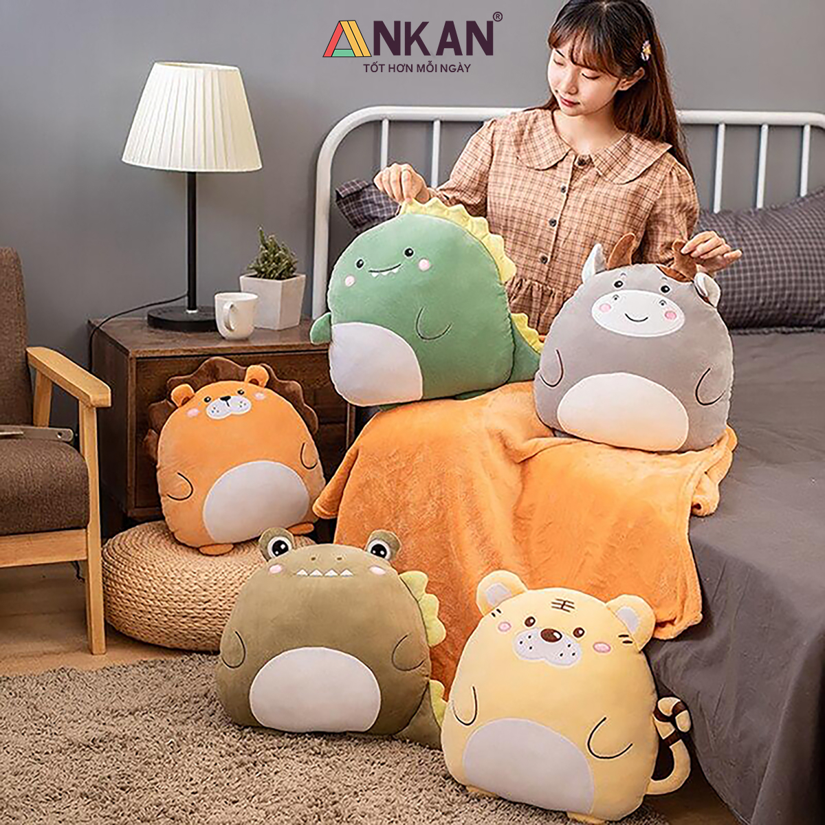 Bộ Chăn Gối Văn Phòng Đa Năng Hình Thú Gấu Bông Dễ Thương, Tiện Lợi Cho Bé Đi Học Và Du Lịch CHĂN GỐI VĂN PHÒNG ANKAN CÓ GÌ ĐẶC BIỆT Thiết kế hình thú xinh xắn, phù hợp làm quà sinh nhật, quà tặng bạn bè, người yêu, đồng nghiệp. Đa năng 3 trong 1: vừa là gối ôm – gối tựa lưng – gối luồn tay, kèm chăn êm giữ ấm. Sử dụng tiện lợi cho nhiều mục đích: ngủ trưa văn phòng, đi học, đi làm, du lịch. Trên sản phẩm có nhãn chữ “はい” (hai) – nghĩa là “Vâng” trong tiếng Việt, mang đến cảm giác dễ thương, tích cực và gần gũi theo phong cách Nhật Bản. CAM KẾT TỪ ANKAN Sản phẩm đúng mô tả, đúng mẫu, đúng kích thước. Đổi trả trong 15 ngày nếu khách không hài lòng. Hoàn tiền 100% nếu sản phẩm lỗi do nhà sản xuất. Đóng gói sạch sẽ, an toàn, giao hàng nhanh chóng. THÔNG SỐ KỸ THUẬT Kích thước gối: 40 x 35 cm. Kích thước chăn: 100 x 170 cm (được lồng gọn trong gối). Chất liệu vỏ: vải nhung siêu mềm. Chất liệu ruột: bông PP cao cấp, an toàn cho da. Trọng lượng: khoảng 800g. Có 4 kiểu dáng để bạn lựa chọn là Cáo Đỏ, Cá Voi Xanh, Cừu Trắng và Gấu Nhật Bản ƯU ĐIỂM NỔI BẬT Vải nhung mềm mịn, thoáng khí, dễ giặt sạch.