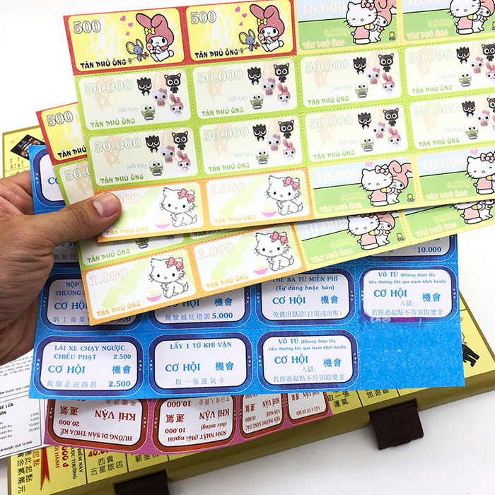 - Bộ sản phẩm gồm: các thẻ, quân cờ, bàn cờ bằng giấy, tiền, nhà,