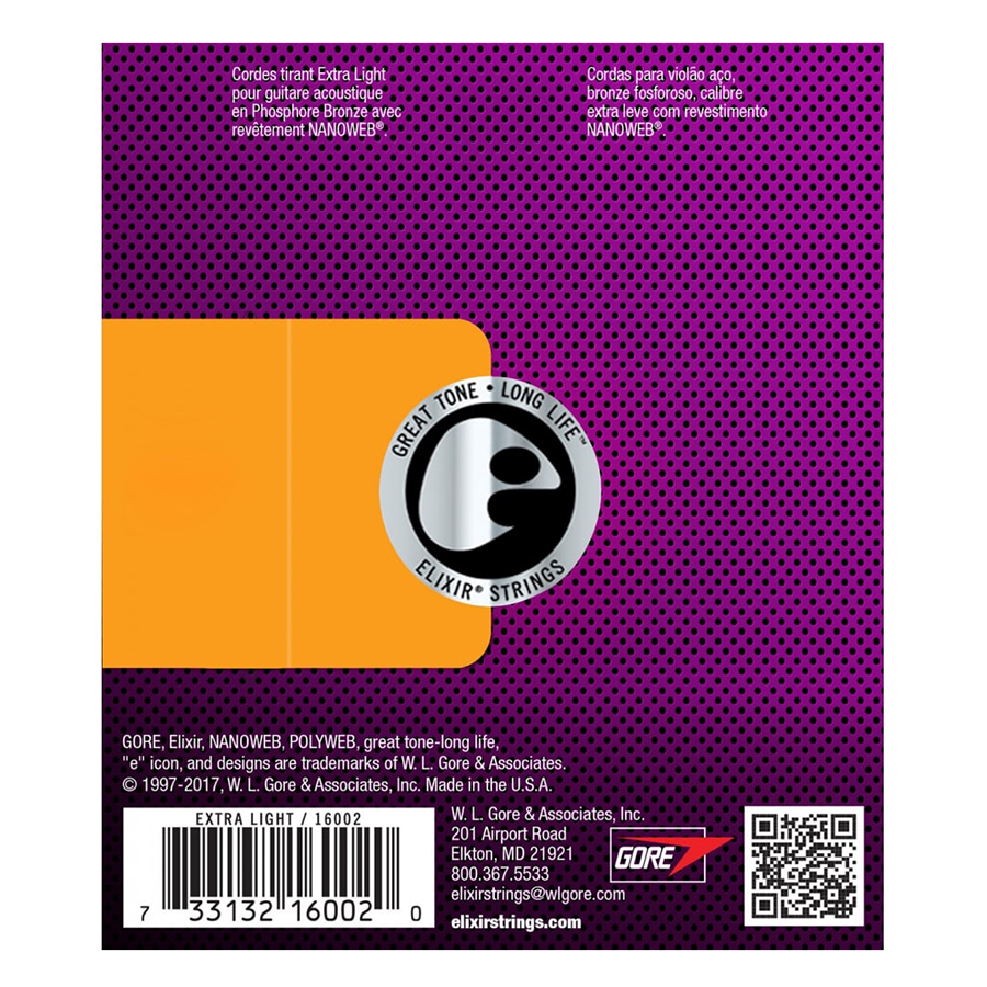 - Bộ Dây Đàn Guitar Acoustic Elixir 16002 được làm bằng dây thép bọc niken, phủ Nanoweb rất mỏng khiến người chơi thấy giống như đang chơi dây thông thường, kích cỡ 10 - 47, loại Extra