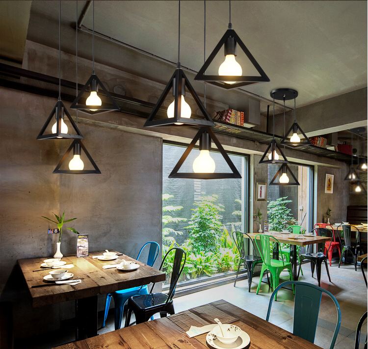 Bộ 3 đèn thả khối tam giác trang trí cao cấp kèm bóng LED và đế ốp trần Đường kính đèn 25 cm. Làm bằng khung sắt sơn tĩnh điện. Phù hợp cho trang trí quán cafe,