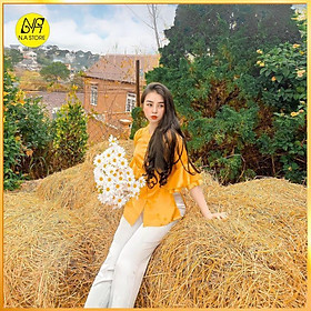 - Áo thiết kế cổ tròn + tay thiết kế xòe hiện đại thời trang