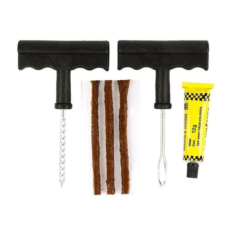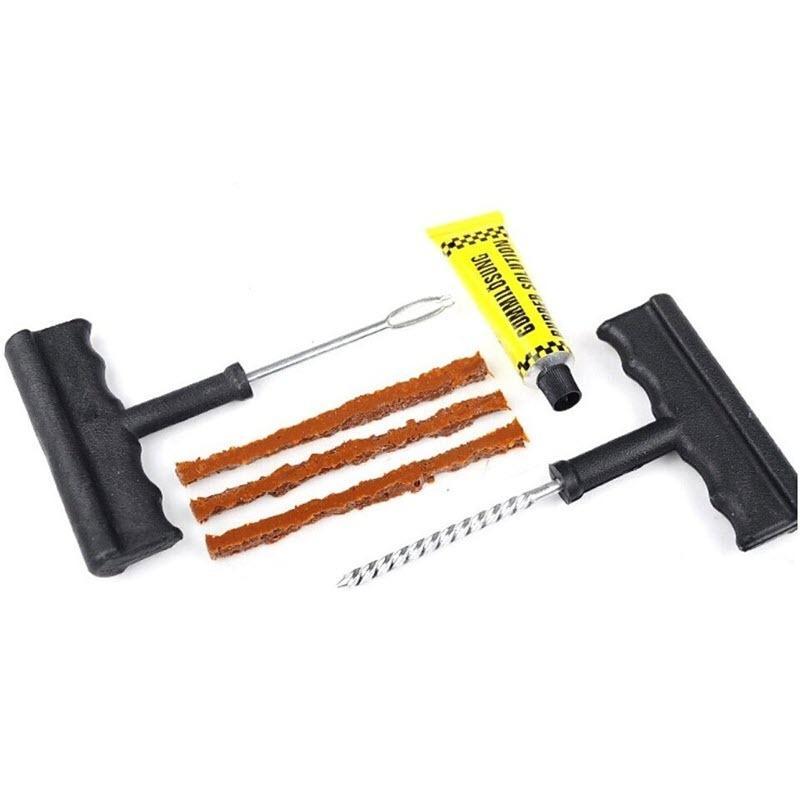 Bộ sản phẩm Dụng Cụ Vá Lốp Không Săm gồm : 1 cây dùi, 1 cây gim, 1 chai keo 12ml và 3 sợi cao su non.