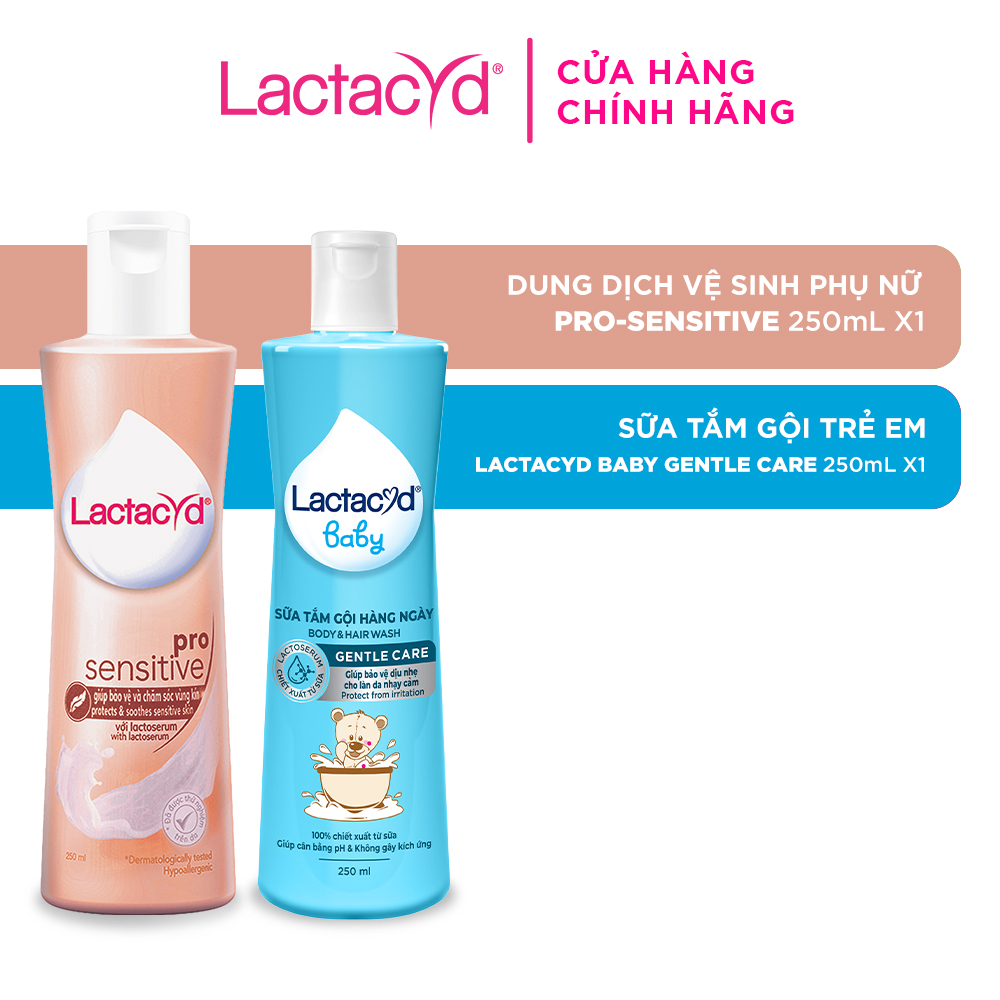 Mua tại TiktokBộ Sản phẩm Dung dịch vệ sinh phụ nữ Lactacyd Pro Sensitive 250ml + Sữa tắm gội trẻ em Lactacyd Bb 250ml (Mẫu mới)