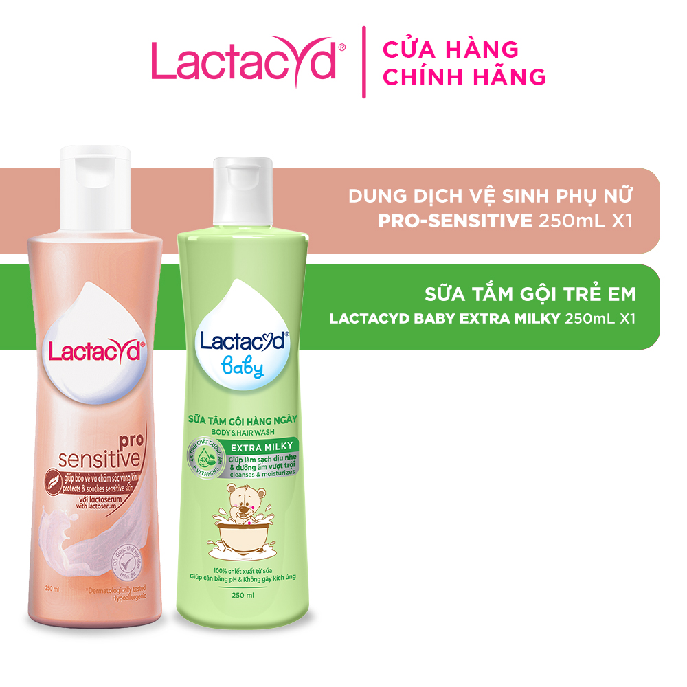Mua tại TiktokBộ Sản phẩm Dung dịch vệ sinh phụ nữ Lactacyd Pro Sensitive 250ml + Sữa tắm gội trẻ em Milky 250ml (Mẫu mới)