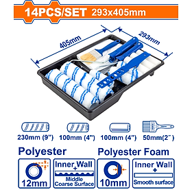 Bộ bao gồm: 2 vỏ con lăn polyester 12mm 230mm, 3 vỏ con lăn polyester 12mm 100mm, 3 vỏ con lăn xốp polyester 100mm, 1 khung lăn hình trụ 230mm, 1 khung lăn hình trụ 100mm, 1 màng bụi nhựa, 1 khay sơn 9", 1 cọ sơn 50mm, 1 khuấy sơn nhựa