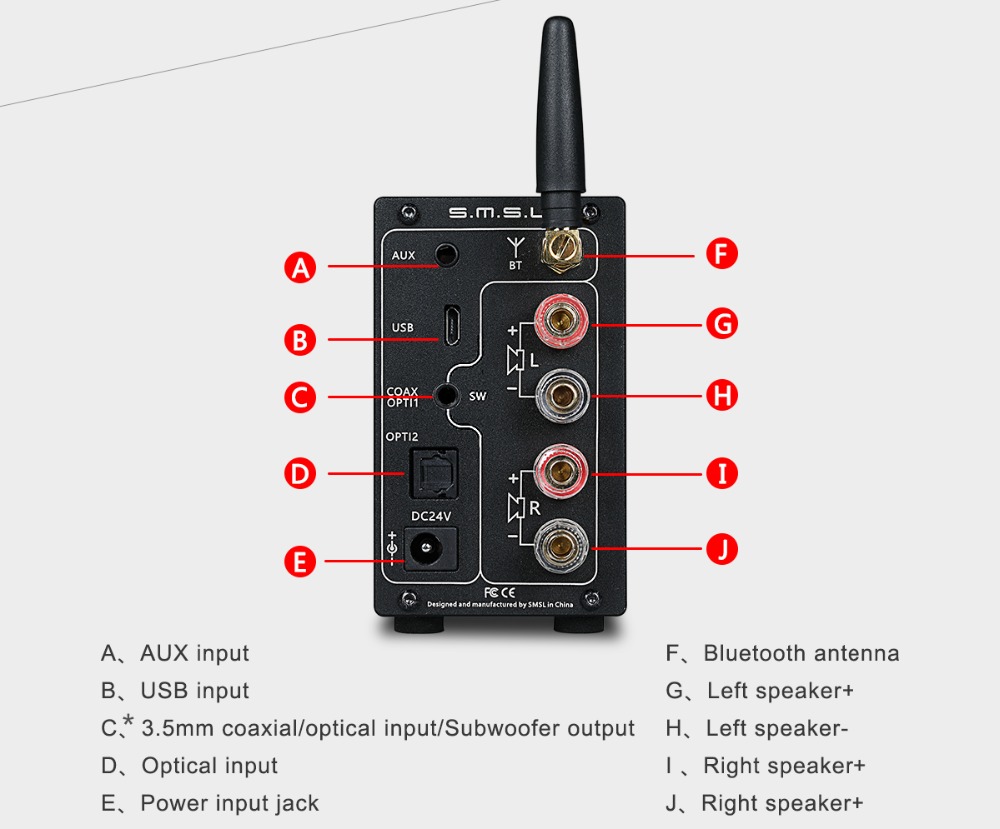 - What you get: SMSL AD18 amplifier, 24V power supply us Plug, Micro USB cable, remote control, antenna, 1 year warranty and friendly customer service SMSL AD18 trở lại với chúng tôi trong phiên bản V3 với lần này là đầu ra Loa siêu trầm tích hợp và khả năng điều chỉnh độ sáng của màn hình (DIMMER). Đầu ra Subwoofer có thể truy cập thông qua cổng giắc cắm 3,5 mm ở chân đế cho đầu vào Đồng trục / Quang học. Như thể hiện trong sơ đồ dưới đây: Mặc dù thực tế là cùng một đầu nối, bạn có thể sử dụng đầu vào Coax / OPTI1 và đầu ra Loa siêu trầm đồng thời với giắc cắm với cáp RCA (hỗn hợp hoặc cáp cái) như thế này: SMSL AD18 là một phần của Bộ khuếch đại kỹ thuật số toàn phần thế hệ mới của FDA. Nó sử dụng chip TAS5508C và TAS5342 công nghệ cao sử dụng quy trình Texas Instrument’s Digital Pure Path. Với thiết kế nhỏ gọn, nó sẽ mang lại độ phân giải cao cho người yêu âm nhạc muốn kết hợp giữa sự nhỏ gọn và chất lượng âm thanh cao. Bộ khuếch đại này có đặc điểm là một "Kỹ thuật số đầy đủ" i. e. rằng tín hiệu S / PDIF hoặc USB được chuyển đổi thành I2s và sau đó được khuếch đại trực tiếp bởi mô-men xoắn TAS5508C và TAS5342. Do đó, đường dẫn của tín hiệu kỹ thuật số được đơn giản hóa cho phép chất lượng phục hồi đáng kinh ngạc của loại thiết bị này. Đầu vào định dạng Bluetooth Bluetooth BT4.2 NFC cho phép bạn tận dụng những phẩm chất của SMSL AD18 bằng cách cung cấp phát lại không dây chất lượng tốt hơn cho iPad, iPhone, iOS, máy tính bảng và điện thoại thông minh Android tương thích. (khoảng cách tối đa 10m trong môi trường xung quanh gần mà không có chướng ngại vật). Bộ khuếch đại tất cả trong một này cũng được trang bị bộ cân bằng kỹ thuật số với nhiều chức năng (điều chỉnh âm trầm, âm bổng, ). Nó sẽ là người bạn đồng hành lý tưởng cho bất kỳ nguồn không dây hoặc không dây kỹ thuật số nào. Công thái học và sự nhỏ gọn của nó không phải là tài sản đáng kể, điều này được bổ sung thêm tính linh hoạt nhờ màn hình TFT 1.44 màu, cho biết chính xác từng chức năng. Để kết nối cáp đồng trục với đầu vào AD18’s Coaxial ở định dạng Giắc cắm 3,5 mm, bạn có thể sử dụng bộ chuyển đổi tương thích này: Bộ chuyển đổi giắc cắm RCA đơn âm 3,5 mm đực sang cái. Lưu ý: Không bao gồm pin AAA cho điều khiển từ xa