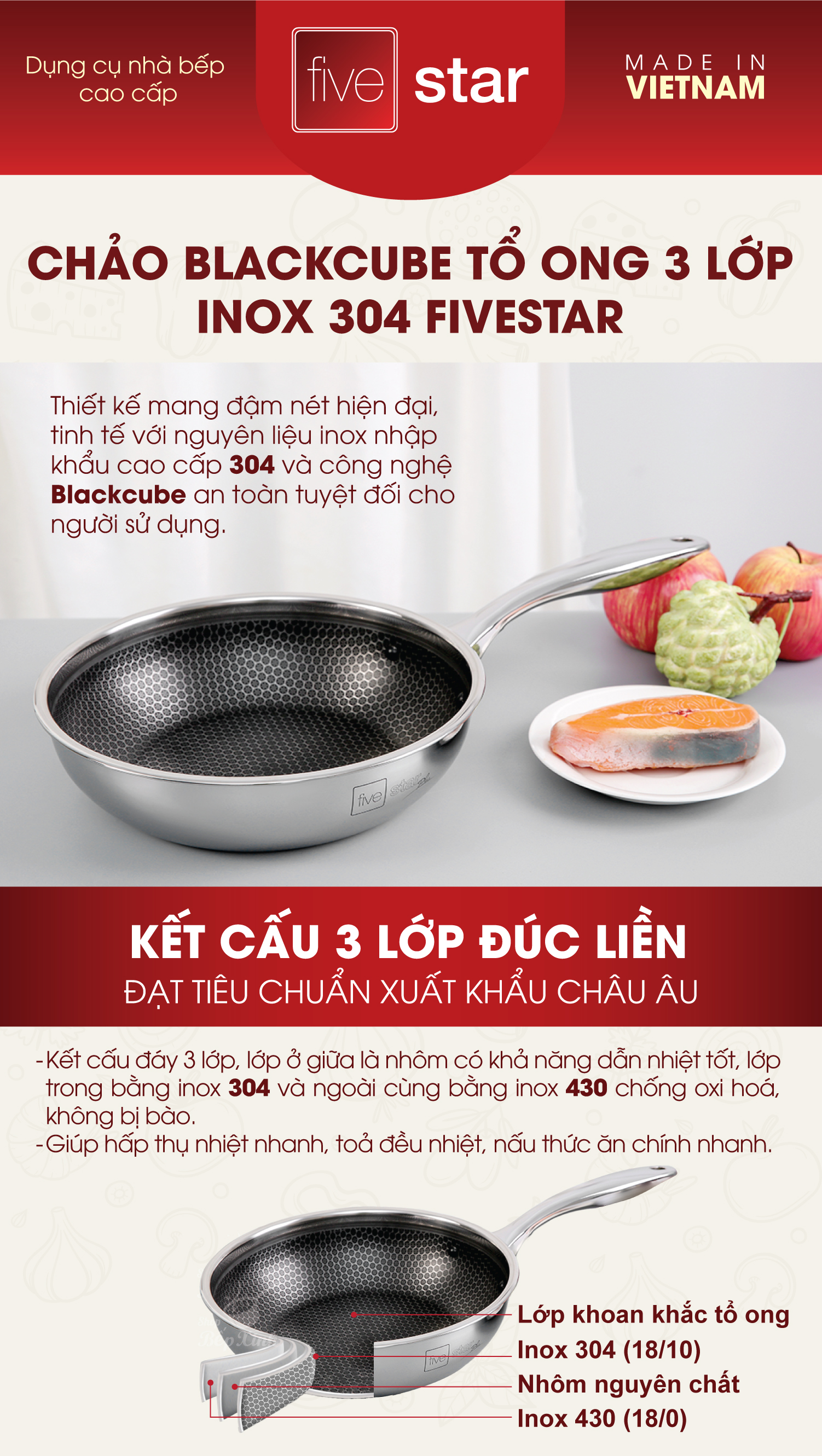 Mua tại TiktokXoong inox 5 đáy Red Velvet được cấu tạo với 5 lớp đáy: 1.Thép không gỉ 18/10 2.Lớp nhôm nguyên chất 3. Lớp lõi hợp kim nhôm đặc biệt 4. Lớp nhôm nguyên chất 5.Thép không