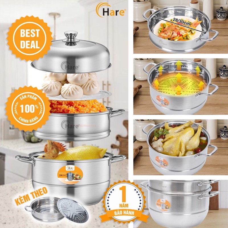 Bộ nồi hấp 3 tầng Inox cao cấp Hare size 28cm/30cm vung kín - Hấp xôi, gà, bánh bao Zalo 0986588655