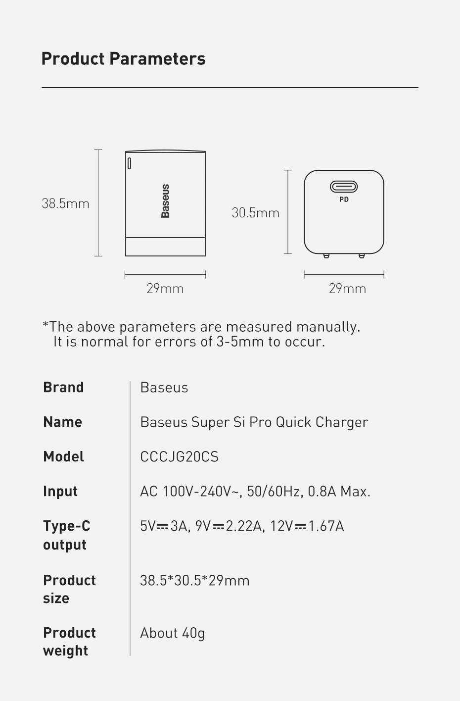 Mua tại TiktokBộ cốc cáp sạc nhanh Baseus 20W Si Pro cho IP13, Củ sạc nhanh IP13 Baseus 20W Super Si Pro Mini USB C hỗ trợ sạc nhanh QC3.0 PD Thông số kỹ thuật: