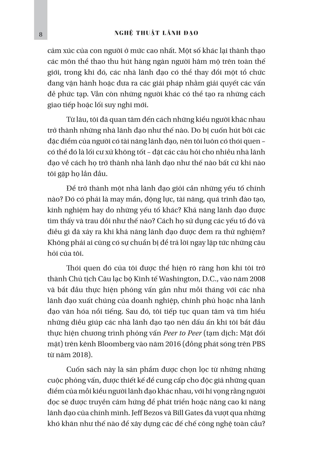 Đó là một loạt những câu hỏi mà David M. Rubenstein – một chuyên gia hàng đầu trong lĩnh vực tài chính và là nhà từ thiện nổi tiếng – đã đặt ra khi tiến hành những cuộc phỏng vấn với những vị lãnh đạo xuất chúng trên thế giới trong các lĩnh vực khác nhau. Ông muốn khai thác những trải nghiệm lãnh đạo cùng kinh nghiệm hết sức quý giá của họ - các giám đốc điều hành, chủ tịch, người sáng lập và những người đi đầu trong ngành tài chính, công nghệ và giải trí, chính trị gia và các nhà lãnh đạo tư tưởng - để hiểu sâu hơn về các nguyên tắc, tầm nhìn và triết lý lãnh đạo của họ. Sau khi hoàn thành các cuộc phỏng vấn, ông đã đúc kết chúng thành cuốn Nghệ Thuật Lãnh Đạo này như một ngọn hải đăng, để từ đó độc giả học được những bài học thực tiễn đầy giá trị từ những thế hệ đi trước.
