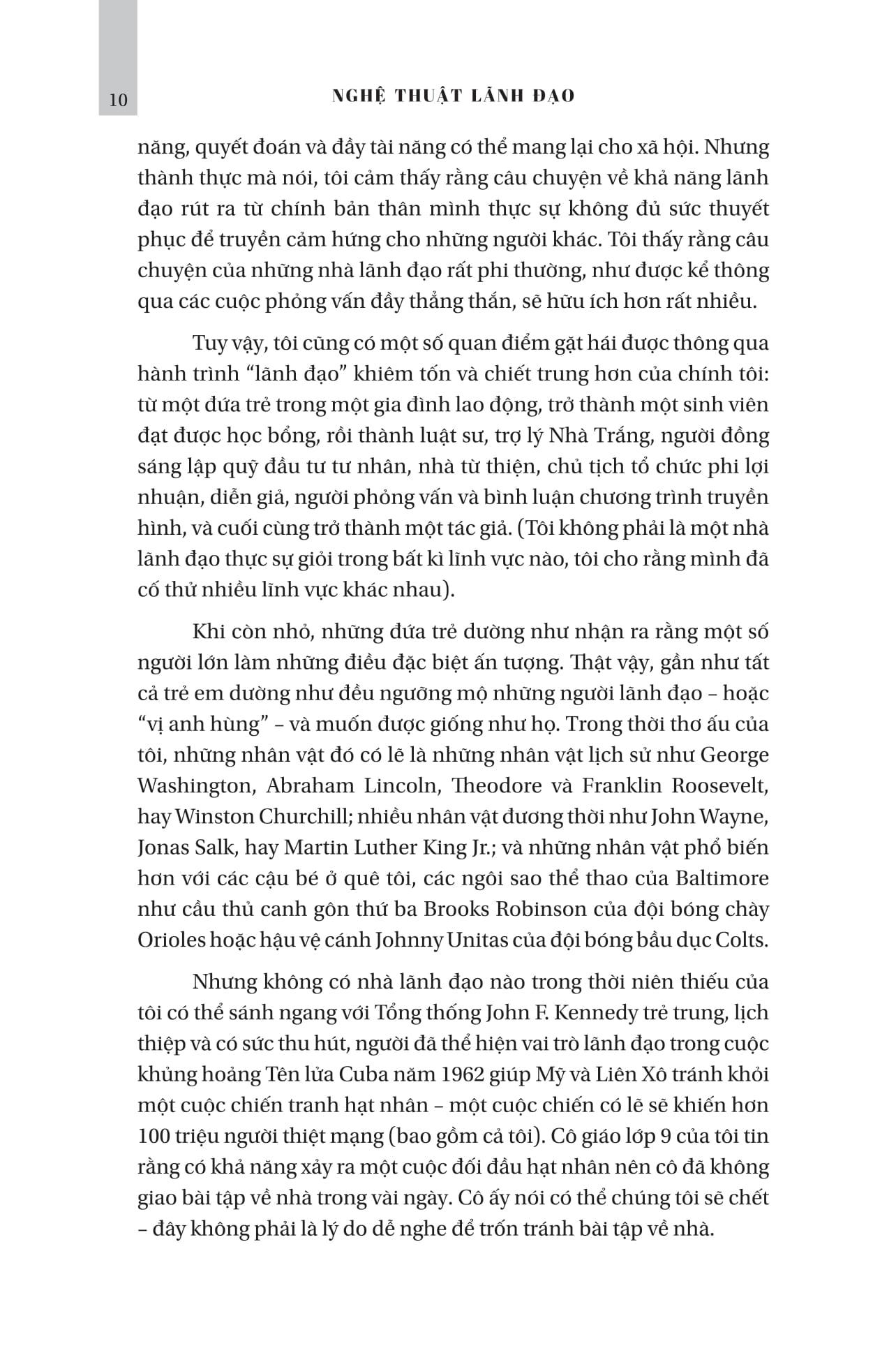 “Khả năng lãnh đạo tồn tại ở nhiều hình thức và được thực hiện theo nhiều cách. Một số nhà lãnh đạo có thể chỉ huy quân đội trong chiến tranh. Những người khác có thể xây dựng các công ty lớn. Một số nhà lãnh đạo có thể phát triển những thành tựu khoa học mang tính đột phá giúp cải thiện cuộc sống của hàng triệu người hoặc sử dụng chuyên môn của họ để đưa ra những khuyến nghị, giải pháp ứng phó với những căn bệnh nguy hiểm mới.” Rubenstein muốn cho độc giả thấy không có một giới hạn nào cho việc trở thành những nhà lãnh đạo cả - như Phil Knight lấy ý tưởng từ bài luận văn nộp cho trường kinh doanh của mình và xây dựng công ty giày thể thao lớn nhất thế giới. Hay Chủ tịch Hạ viện Nancy Pelosi sau khi trở thành bà mẹ của 5 người con, đã muốn trở thành nhà hoạt động chính trị vì cứ 5 trẻ em lại có 1 đưa trẻ đi ngủ với chiếc bụng đói - điều quan trọng là mọi người đang thực sự mong muốn điều gì và hành động ra sao để đạt được điều mình muốn.