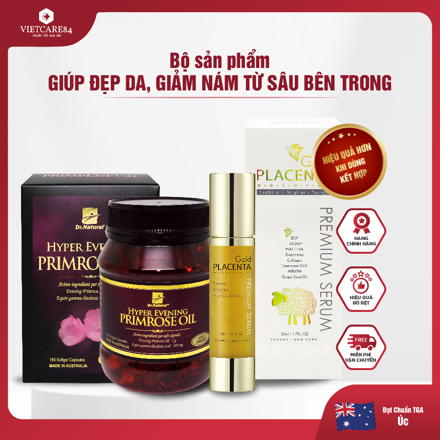 ✨Bộ Sản Phẩm Đẹp Da, Giảm Nám: Viên Nội Tiết Hyper Evening Primrose Oil 180 Viên, Serum Vàng Nhau Thai Cừu Dr Natural Gold Placenta Premium 50ml