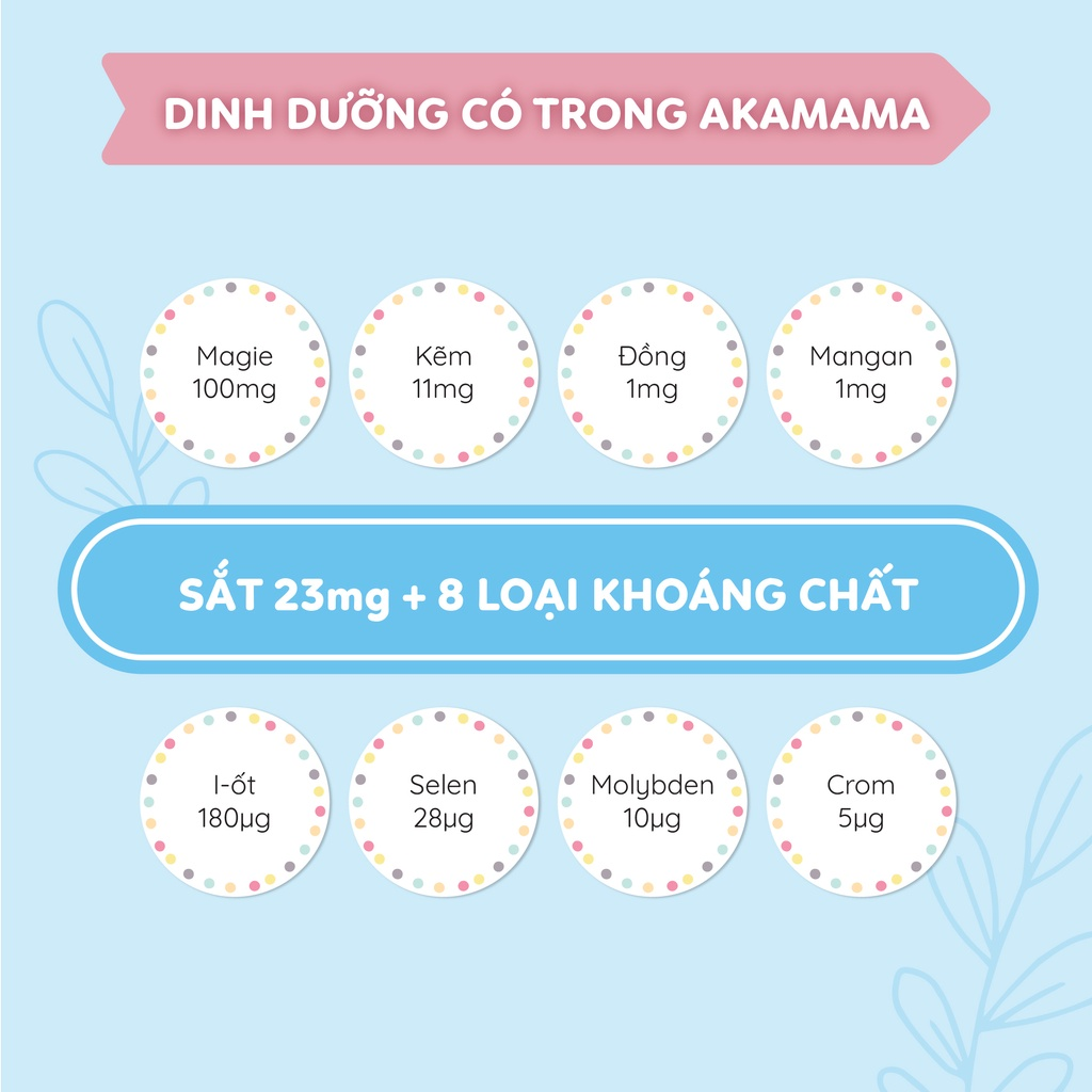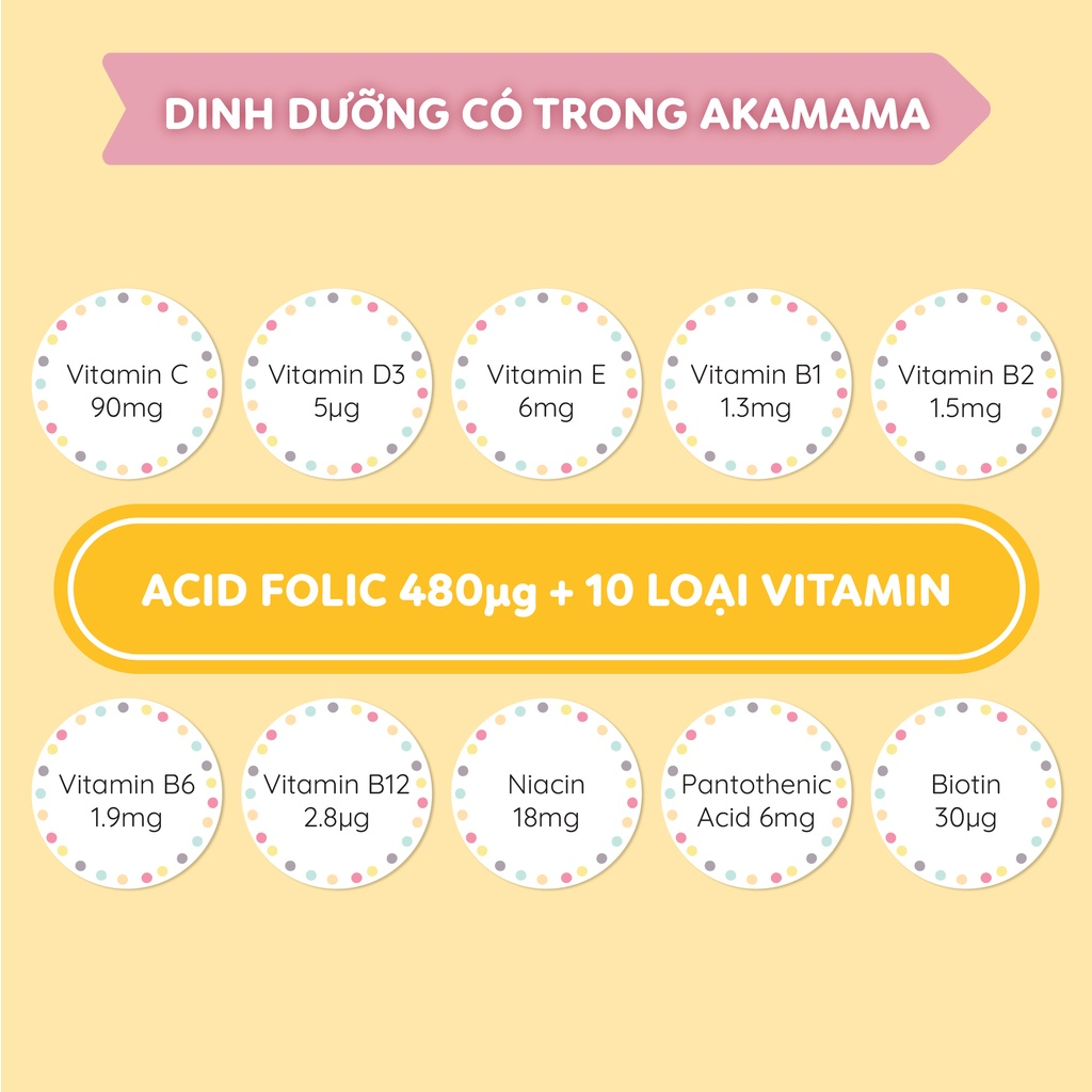 Mua tại TiktokGiới thiệu Vitamin tổng hợp Akamama là sản phẩm được nhiều mẹ bầu tin dùng để bổ sung đầy đủ các vitamin và khoáng chất cần thiết cho cả mẹ và bé trong suốt thai kỳ. Với thành phần tự nhiên và công thức khoa học, Akamama giúp hỗ trợ sức khỏe của mẹ bầu, đảm bảo sự phát triển toàn diện của thai nhi. Đặc điểm nổi bật Bổ sung 11 loại vitamin và 9 loại khoáng chất cùng lợi khuẩn giúp hỗ trợ tăng cường sức khỏe cho phụ nữ trong giai đoạn chuẩn bị mang thai, đang mang thai và cho con bú.
