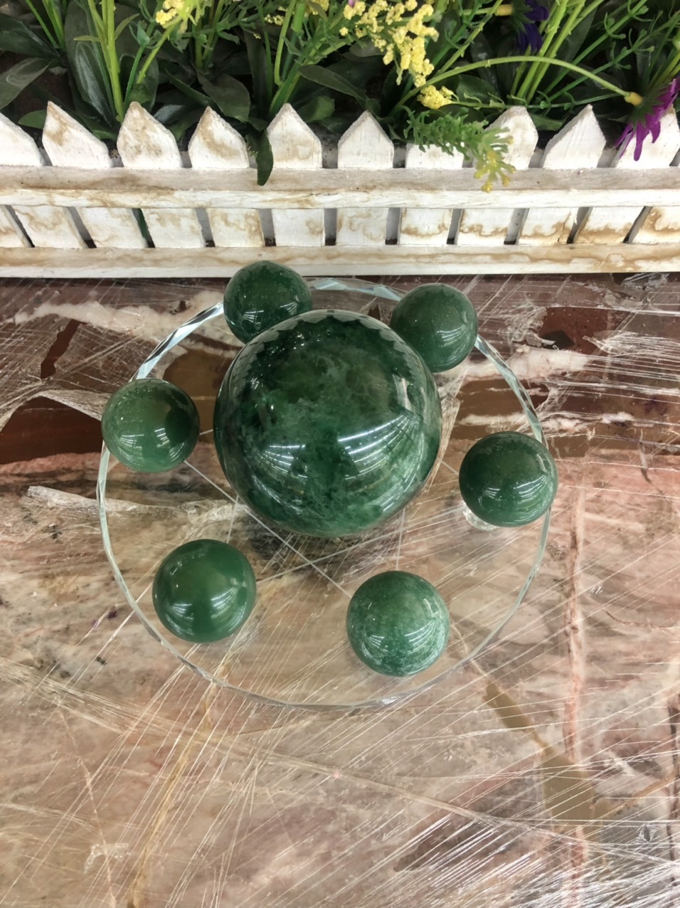 Mua tại TiktokHợp mệnh: Hỏa - Mộc Khối lượng: Bi chủ ở giữa nặng 770g, các viên xung quanh nặng 60g Kích thước: Quả cầu 770g có đường kính 7,6cm; Quả cầu phụ nặng 60g có đường kính 3,5cm; Dĩa có đường kính 18cm Chất liệu: Dĩa là Pha lê, Bi chính và phụ là đá thạch anh