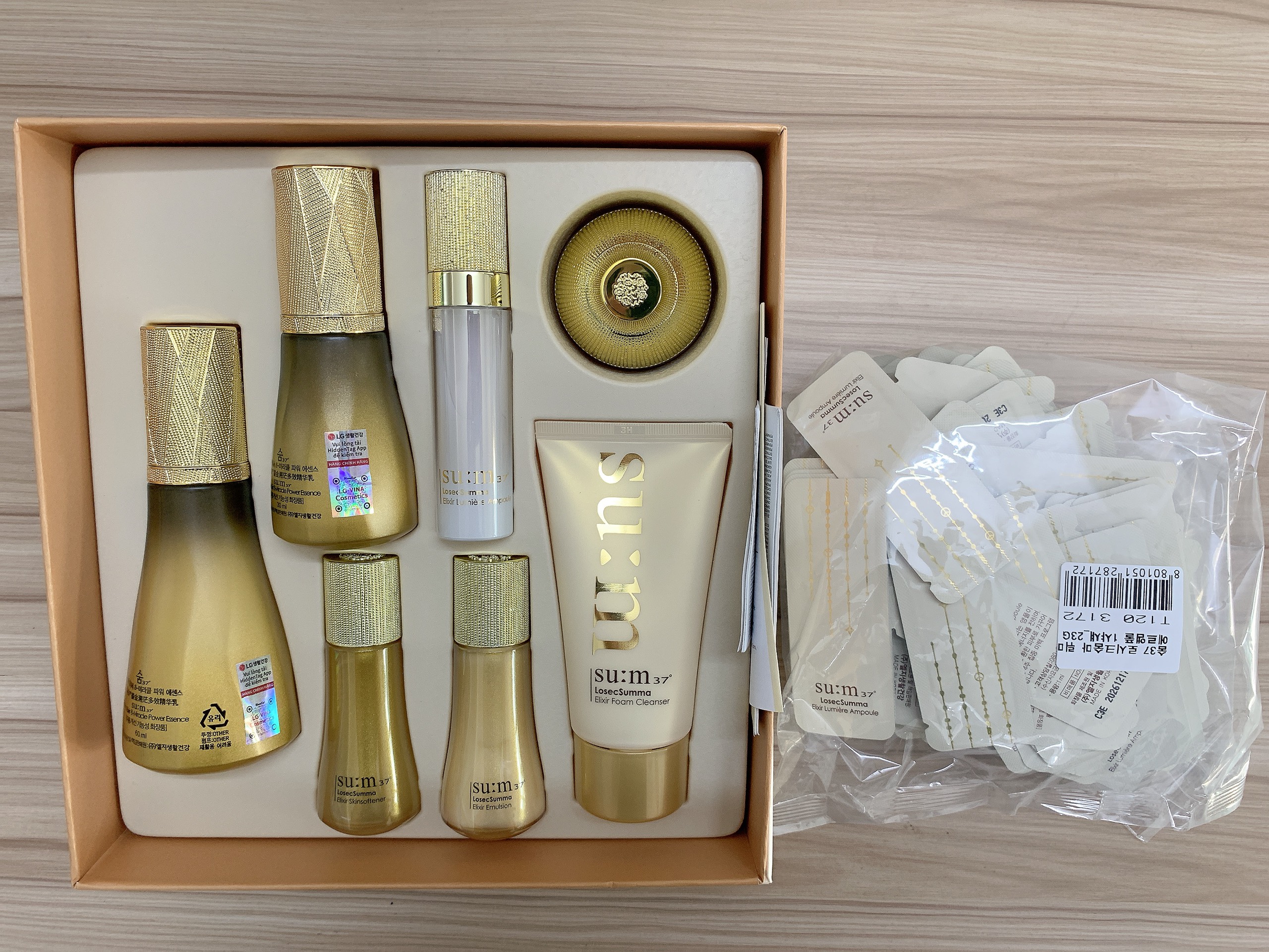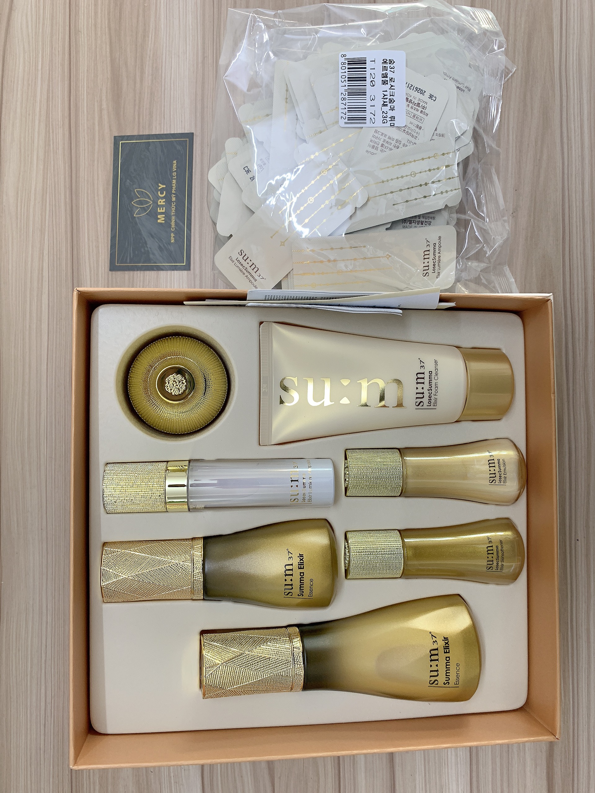 Bộ sản phẩm gồm: –Tinh chất chống lão hóa đa tác động cải thiện 8 vấn đề chuyên sâu Su:m37 Losec Summa Elixir Essence 60ml + 30ml – Nước cân bằng tái sinh da Sum37 Losec Summa Elixir Skin Softener 20ml – Sữa dưỡng cân bằng dầu và độ ẩm Su:m37 Losec Summa Elixir Emulsion 20ml – Kem dưỡng tái sinh da Su:m37 Losec Summa Elixir Cream 10ml – Sữa rửa mặt tái sinh da chiết xuất vàng Su:m37 Losec Summa Elixir Foam Cleanser 60ml – Tinh chất dưỡng trắng hồng Su:m37 LS Lumiere Ampoule 10ml Siêu tinh chất Losec Summa 8-Miracle