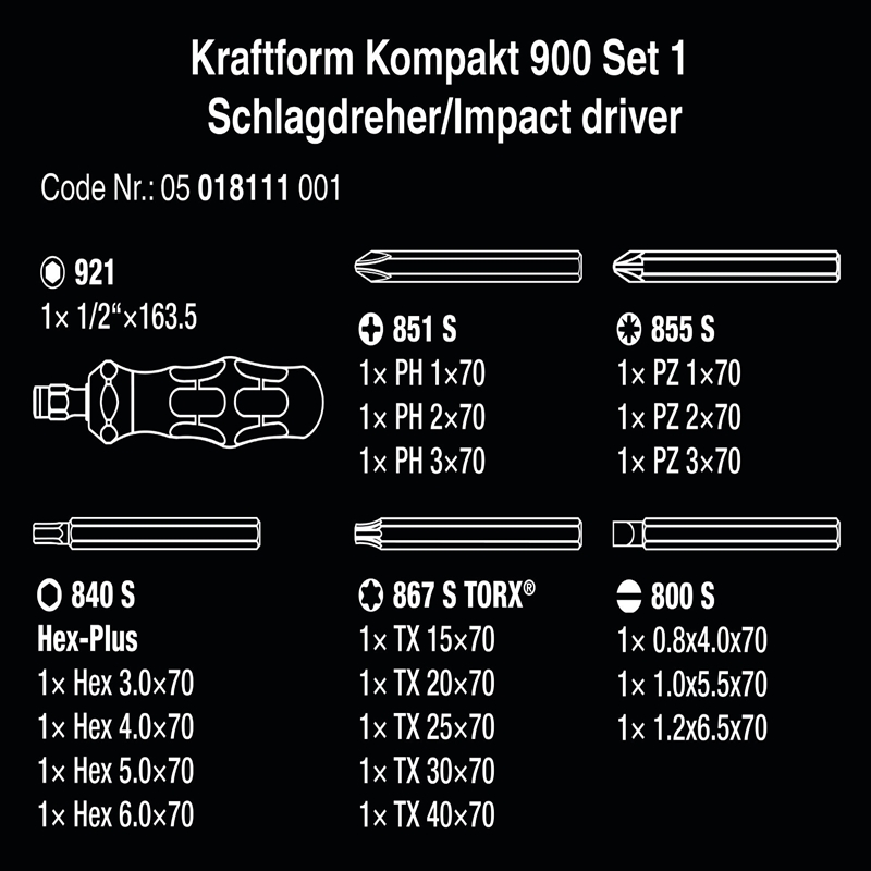 ✨Bộ tua vít đóng nới lỏng ốc vít Wera 05018110001 Kraftform Kompakt 900 Set 1 gồm 19 chi tiết với các đầu vít dài 70mm